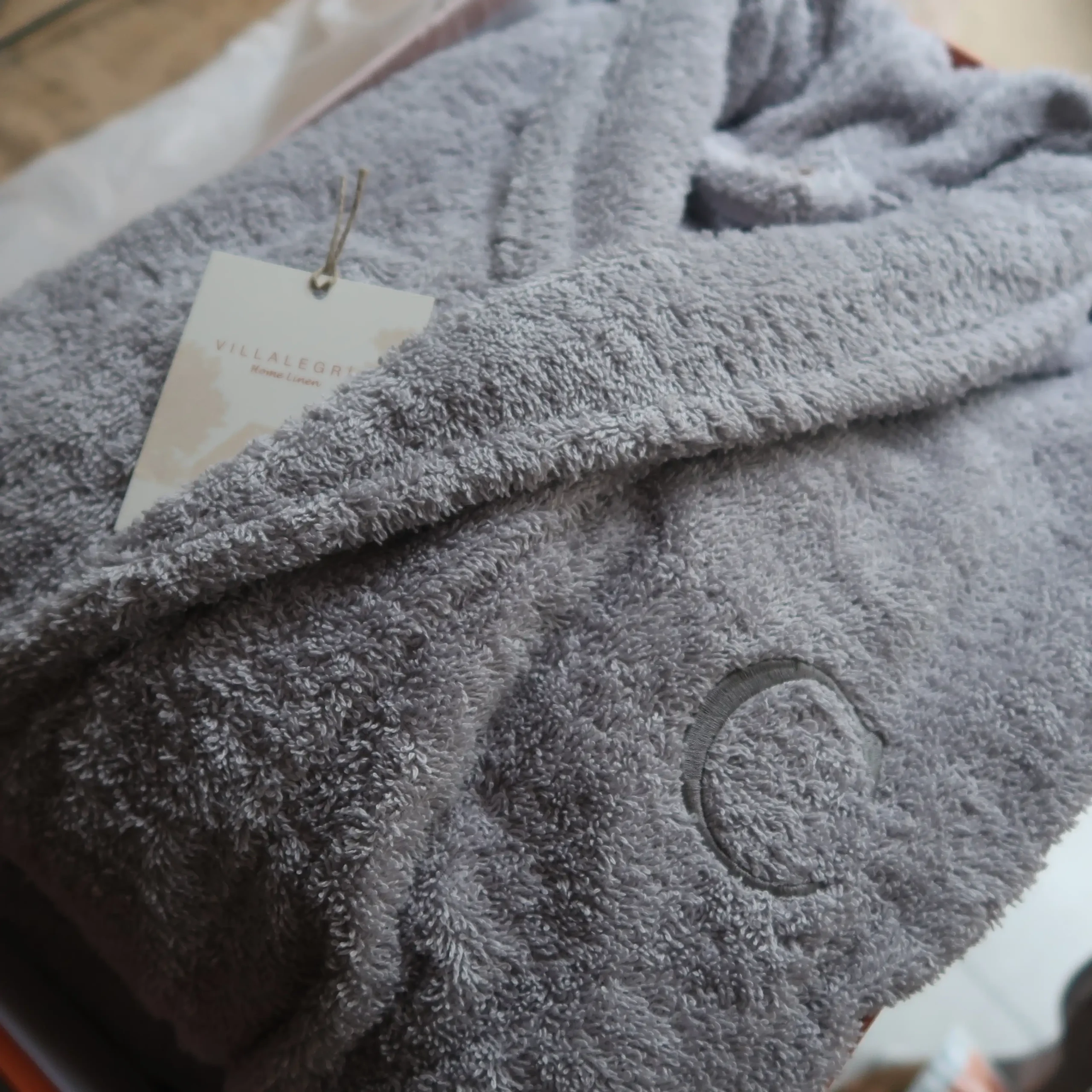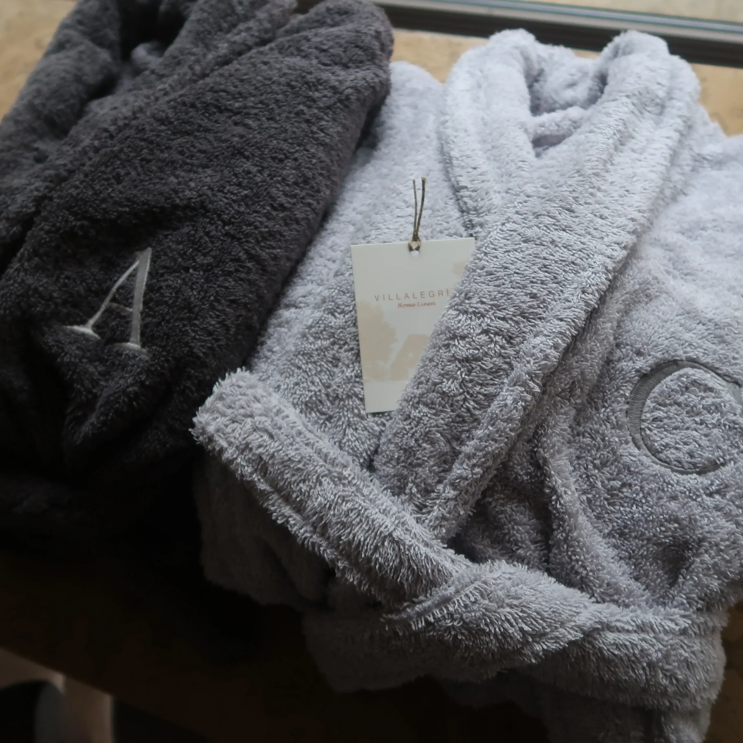 Albornoz de algodón egipcio de rizo de 400 gramos, que personalizamos con tus iniciales para una experiencia de baño especial.