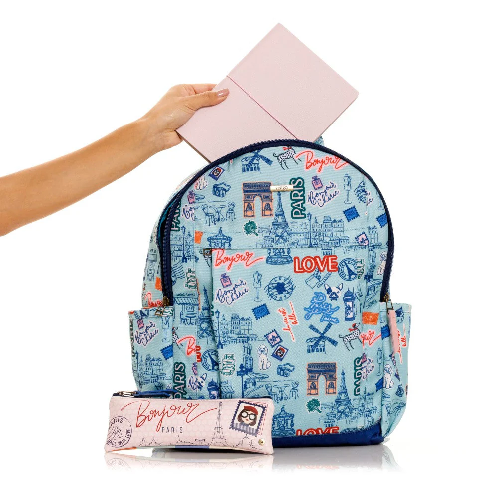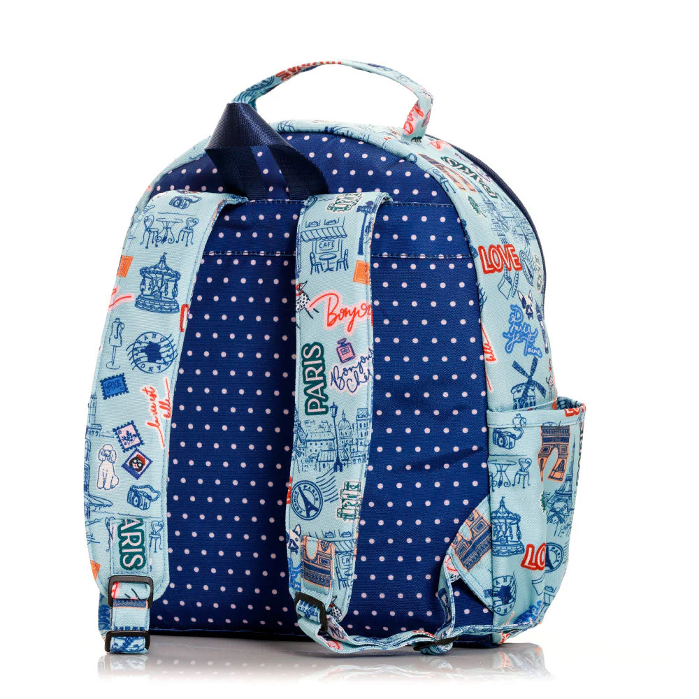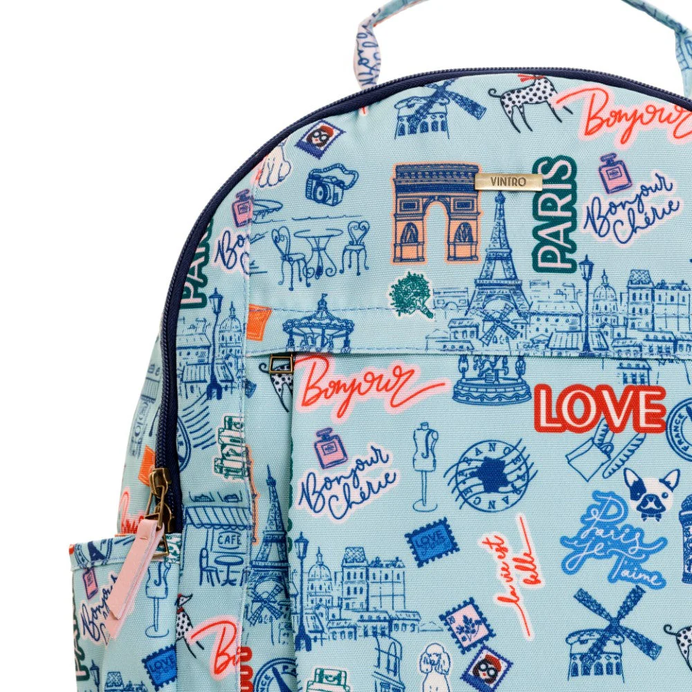 Morral estampado en la colección Paris. Elaborado en tela lona semi impermeable, cuenta con tres compartimientos principales; bolsillo con cierre interno, espacio para pc y carpetas, bolsillos laterales para el termo y cargaderas graduables.
