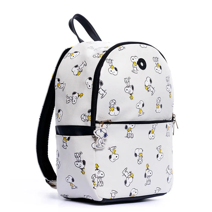 Morral estampado en la parte frontal y laterales en la colección Snoopy, con cargaderas en cuero vegano y bolsillos laterales. Bolsillo delantero con cierre perfecto para el celular o las llaves. Interior en tela anti fluido, compartimiento interno cómodo para el computador. Exterior en cuero vegano 100% Colombiano.