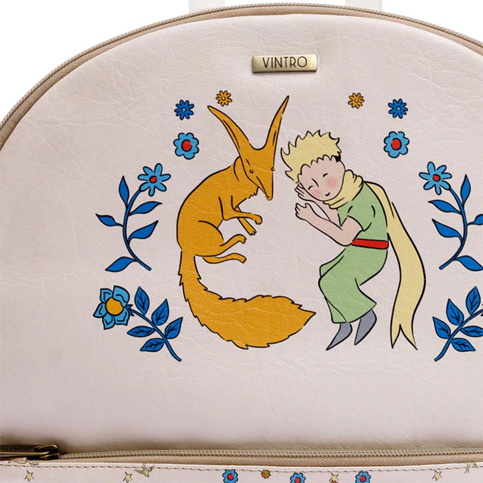 Backpack estampado en la parte frontal y laterales en la colección Principito, con cargaderas en cuero vegano y bolsillos laterales. Bolsillo delantero con cierre perfecto para el celular o las llaves. Interior en tela anti fluido, compartimiento interno cómodo para el computador. Exterior en cuero vegano 100% Colombiano.
