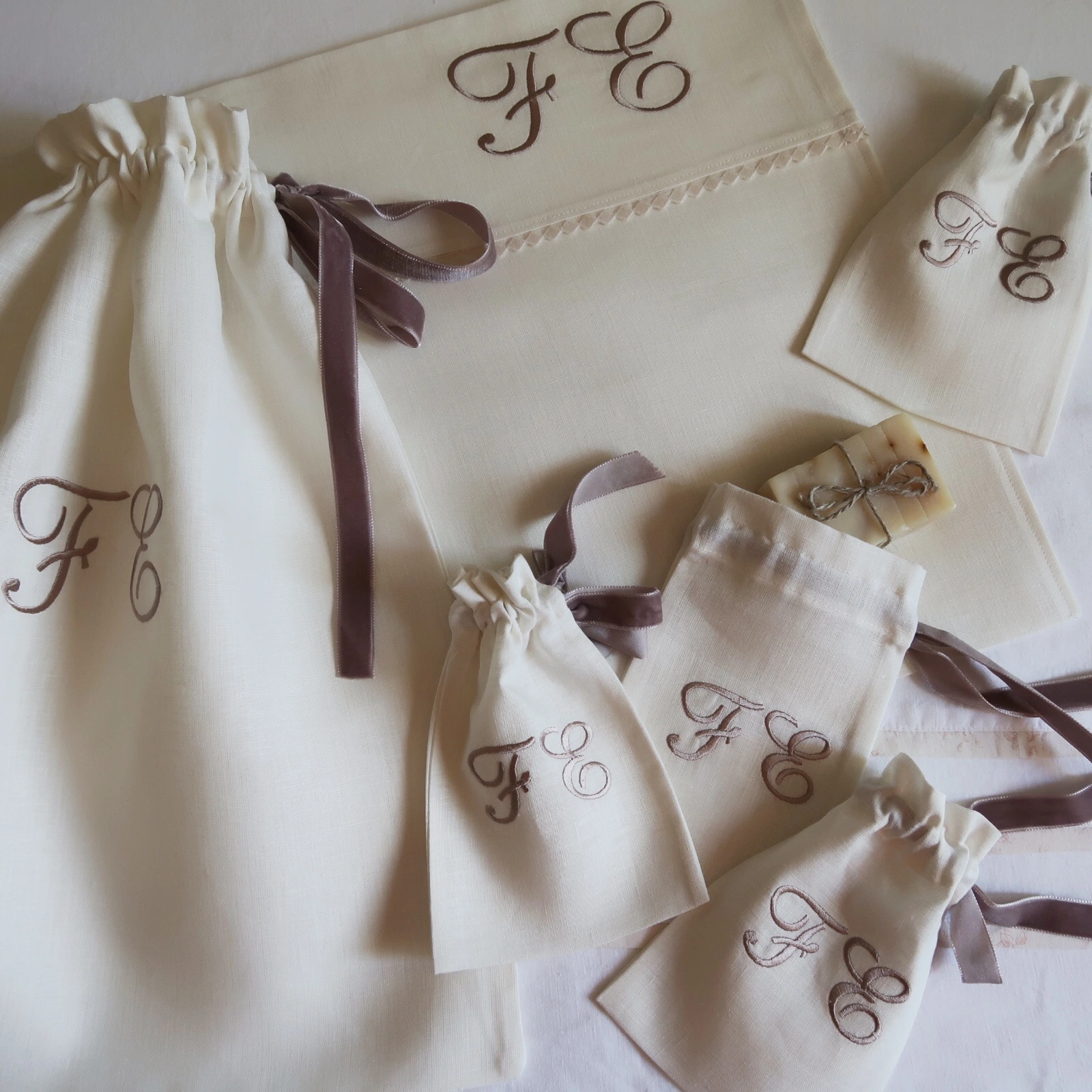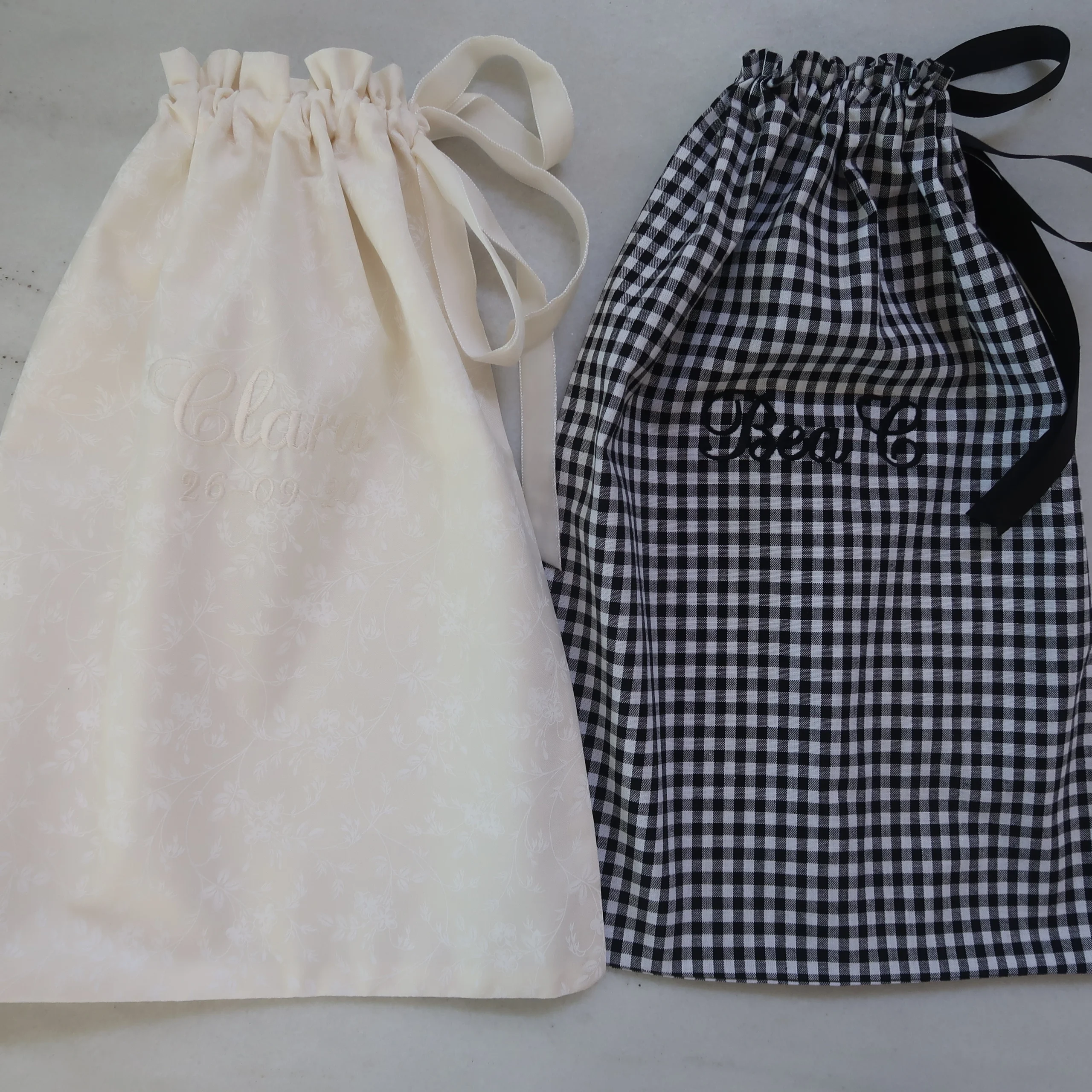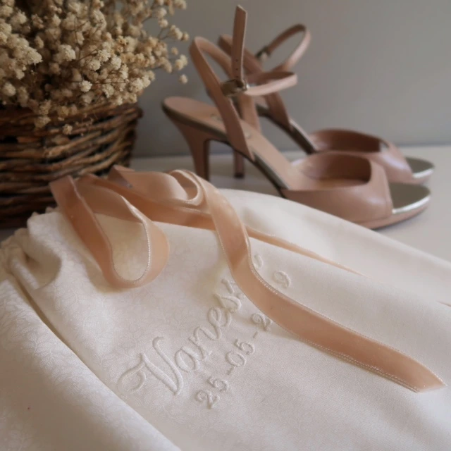 Bolsa para zapatos, perfectas para guardar tus zapatos de novia cuando llega la hora de bailar. Pueden bordarse a juego con tus saquitos de alianzas y arras.