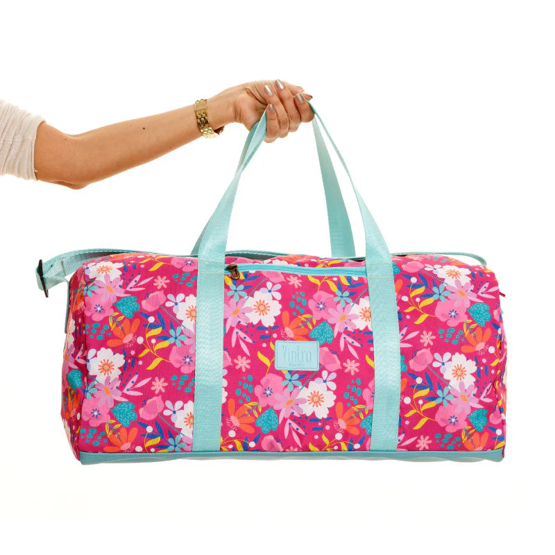 Bolso de viaje en lona con estampado de colección Yo Te Cielo. Liviano, ideal para viajar o para ir al gimnasio. Bolsillo en la parte frontal ideal para artículos pequeños como tu celular o monedero, y cargadera en poliéster.