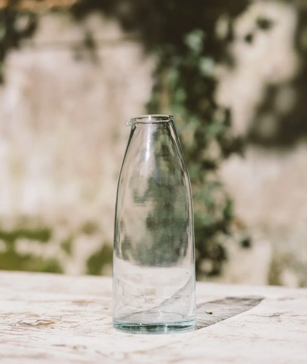 Botella para agua o leche hecha mediante la técnica de vidrio soplado reciclado. Ideal para tus comidas del día a día, o para servir un té o un zumo con nuestros vasos de vidrio soplado reciclado. De fabricación artesanal, pueden presentar burbujas o irregularidades. Todas las piezas, al estar hechas de vidrio reciclado y artesanalmente, presentan un acabado de gran calidad que las hace resistentes al lavavajillas y al microondas.