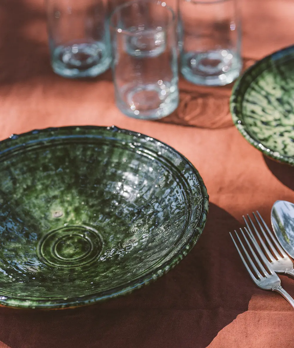Presentamos dos líneas en cristal soplado, ambas de gran belleza por sus formas y colores y a la vez muy prácticas por su calidad y sencillez, que las hace ideales para su uso cotidiano. Nuestra línea de Marruecos se produce mediante el reciclado de dos toneladas diarias de desechos de recipientes y botellas de vidrio, que se funden en un horno a aproximadamente 1.600 grados y se mantienen a esa temperatura durante 24 horas. Una vez extraída del horno la masa candente de vidrio, cada pieza se sopla individualmente y se corta a mano con una llama de oxígeno y gas. Los escombros vuelven a la fusión, mientras que las piezas con la forma final se colocan en un horno de cocción durante otras tres horas; a continuación son lavadas y transportadas en un riel a su ubicación de almacenamiento.