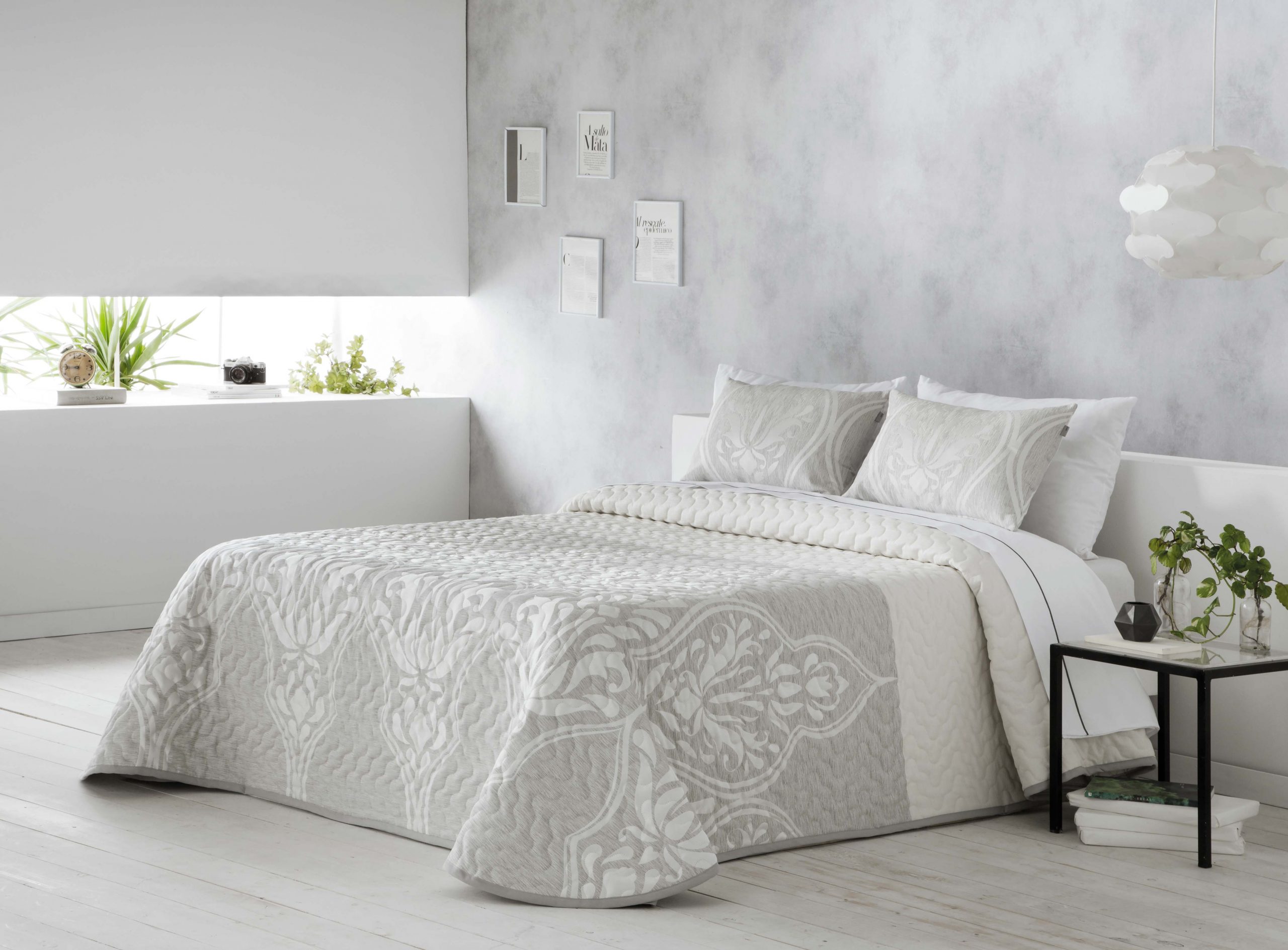 Bouti modelo TITA confeccionada en tejido jacquard con motivos florales en blanco sobre fondo de natural y gris. Producto de máxima calidad.