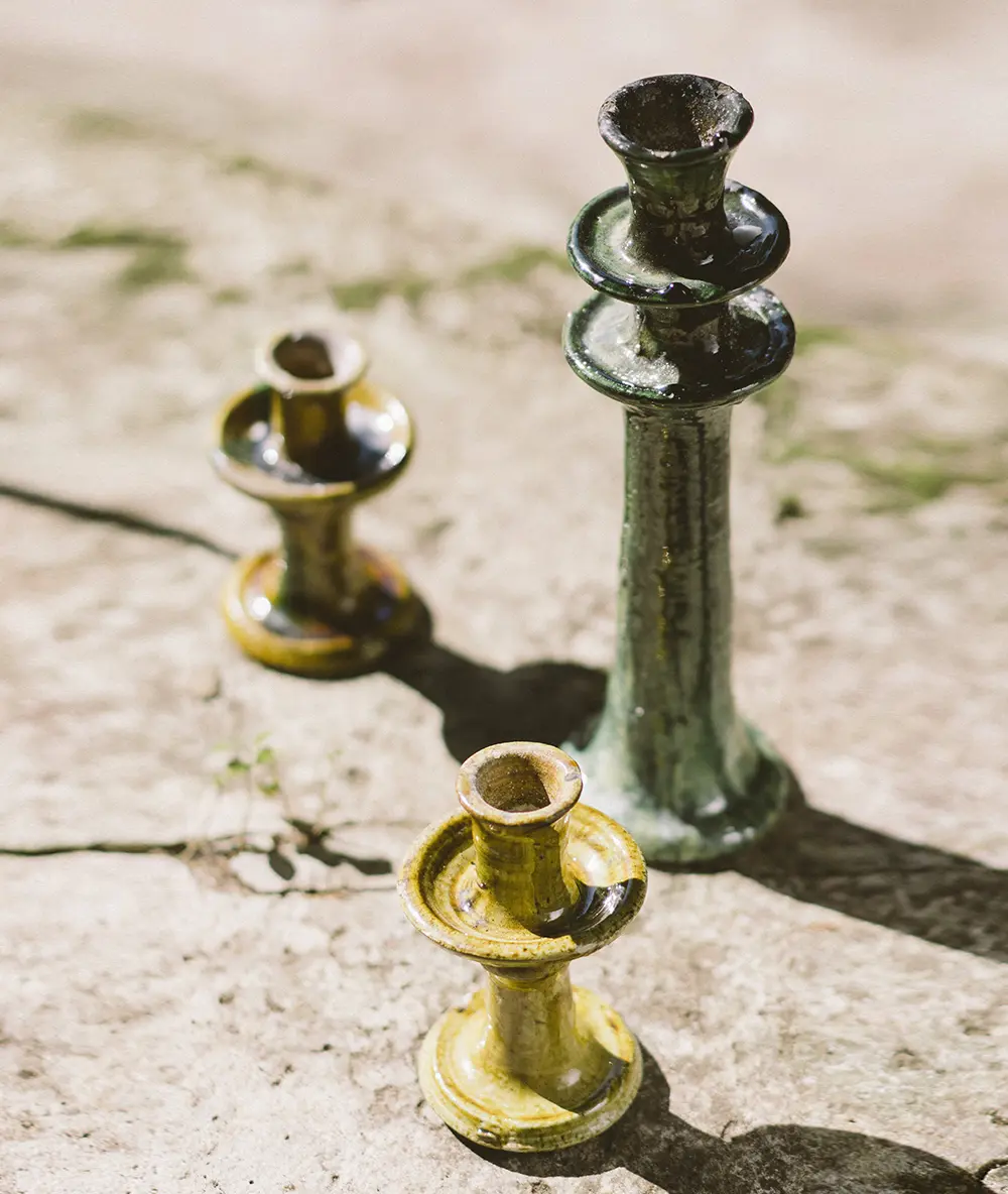 Candelabros diseñados y hechos a mano en Marruecos. Prueba a mezclar nuestros candelabros artesanales, diversos tamaños y formas. Esta preciosa cerámica es originaria de Tamegroute en Marruecos. Esta cerámica se realiza a mano, en barro o arcilla esmaltada con cobre y manganeso. Cada pieza es única. Color verde o henna.