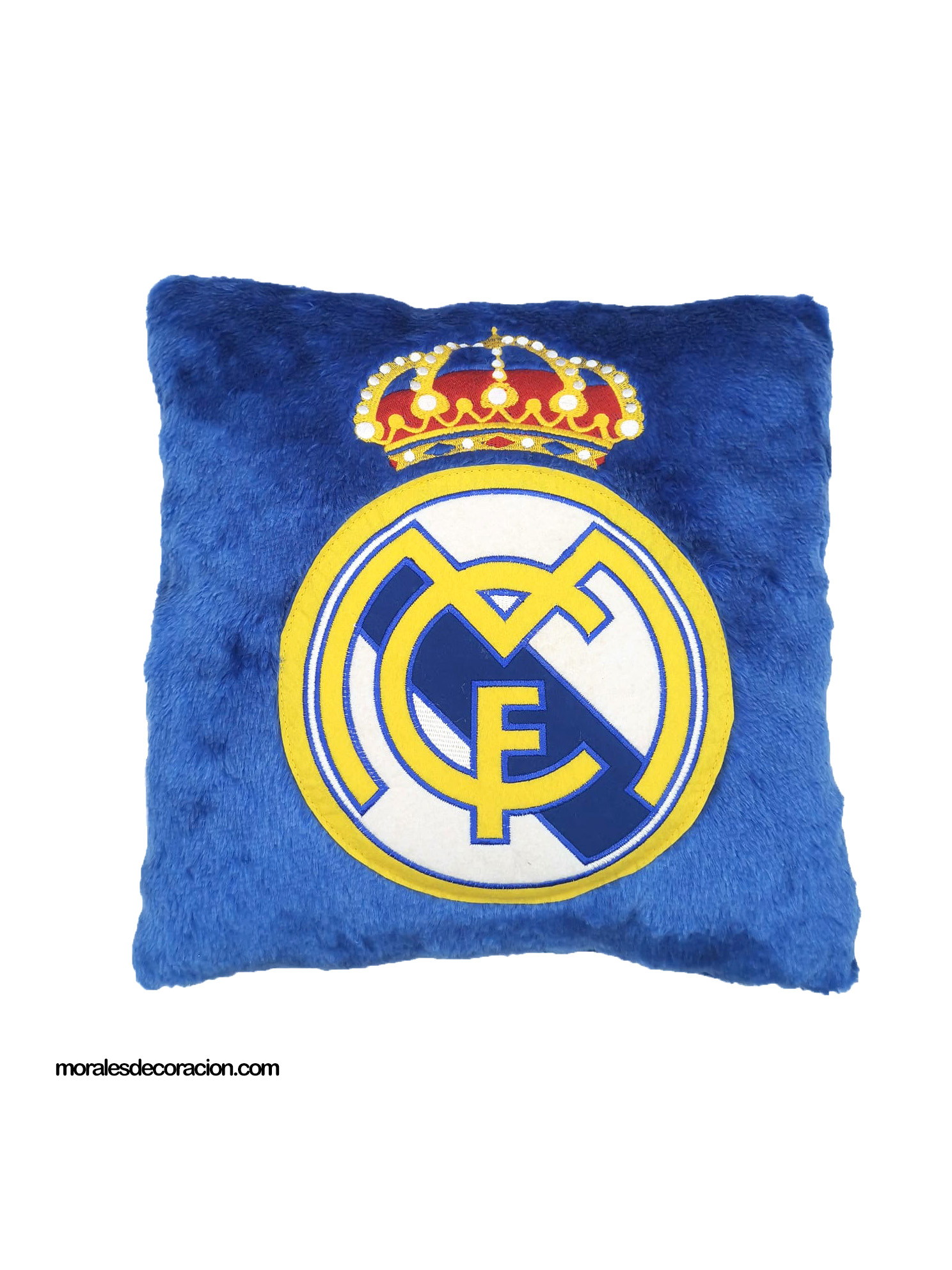 Cojín 3D Real Madrid decorativo oficial del Real Madrid de terciopelo con tacto muy suave. Con el diseño del icónico equipo de fútbol Real Madrid en fondo azul marino.