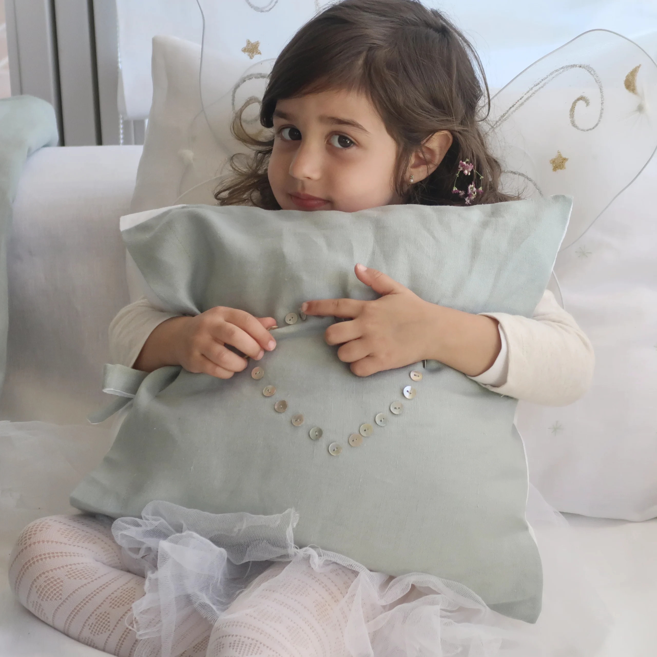 El cojín Corazón está decorado con pequeños botones de nácar cosidos a mano, uno por uno, con forma de corazón. Los bordo sobre una funda de suave lino cien por cien. Está disponible en dos colores muy sutiles y fácilmente combinables, verde agua y blanco aunque si quieres algún otro color puedes ponerte en contacto conmigo a través del mail y lo personalizo a tu gusto. Mide 40 x 40 cm y va rematado con una lazada del propio lino. La trasera siempre la hacemos en color blanco.