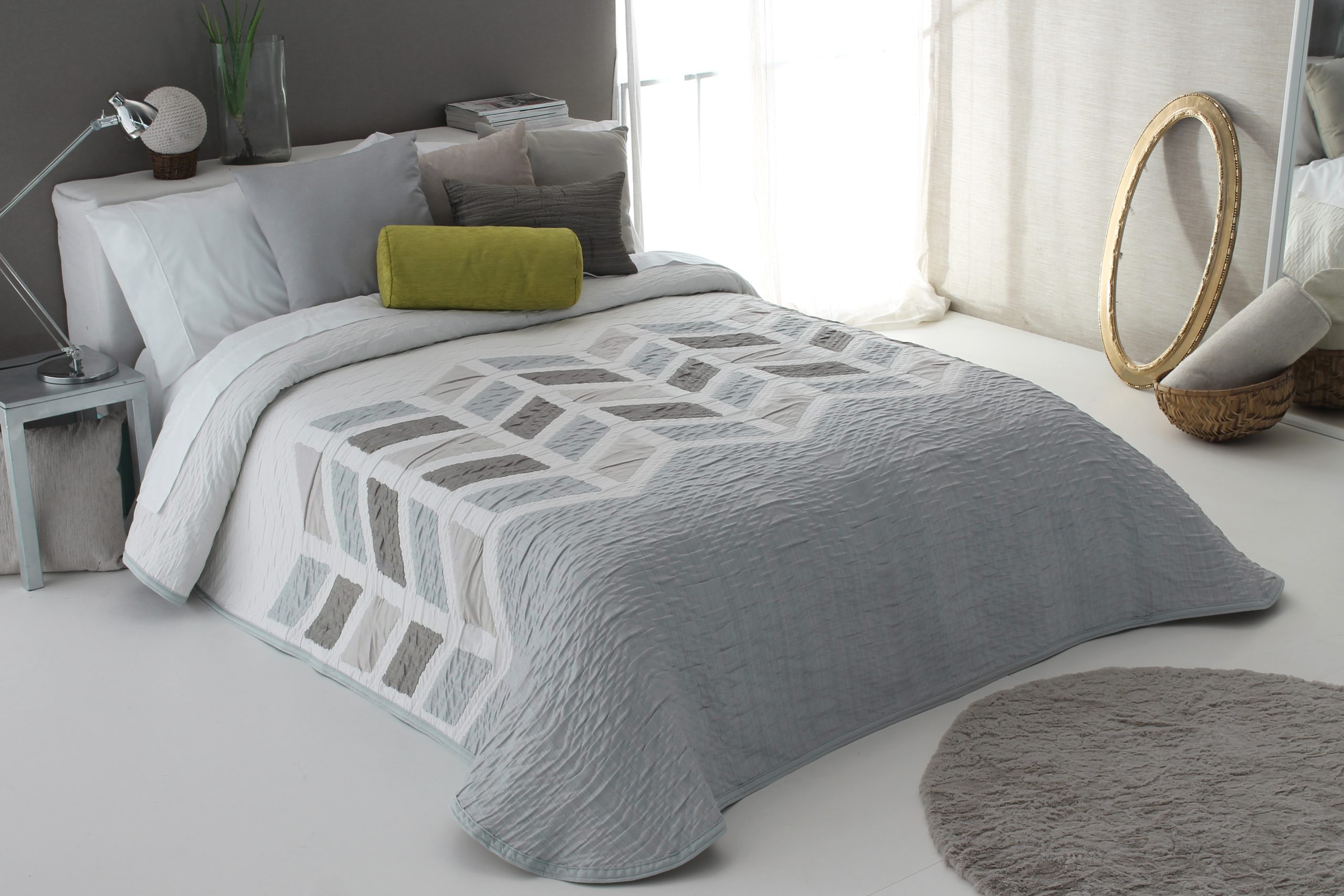Colcha de gama alta realizada en tejido jacquard efecto rugoso de tacto suave y muy agradable.