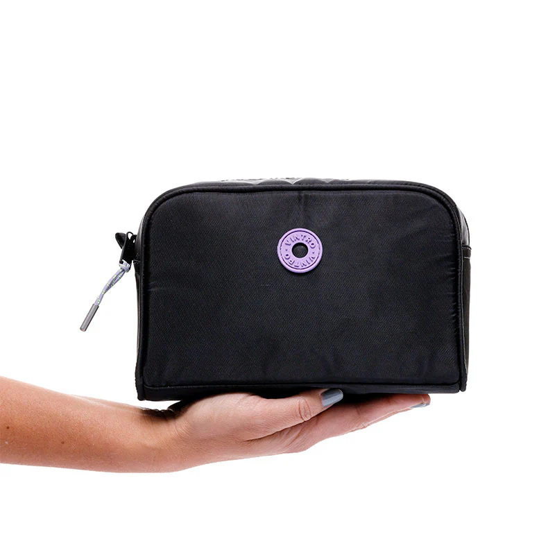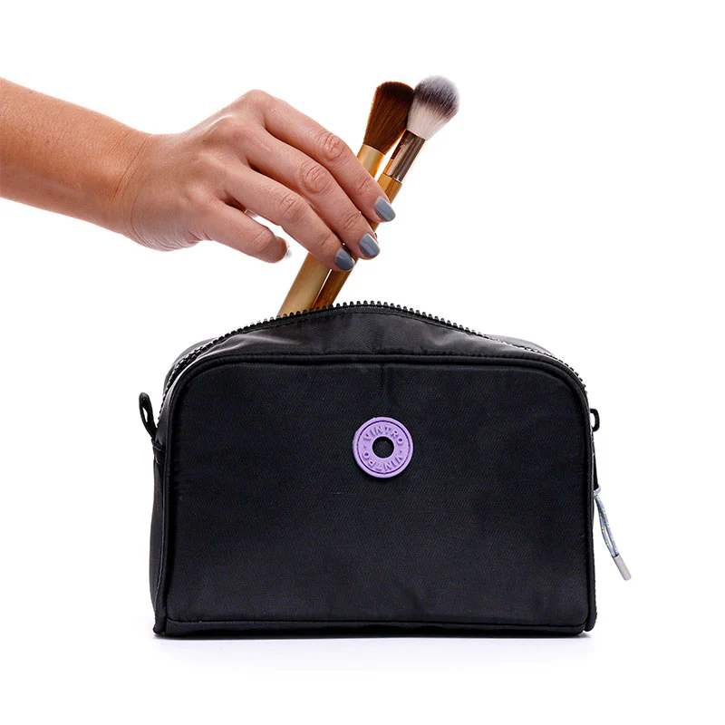 La cosmetiquera Catar, en sofisticado color negro y elaborada en lona satinada, es ideal para llevar tu maquillaje o artículos de aseo con estilo. Te permite organizar tus esenciales de manera práctica, ya sea en casa o en tus viajes.