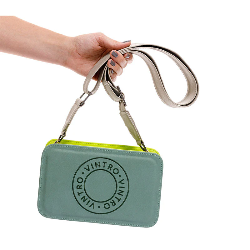 El manos libres Viena combina elegancia y estilo. Su diseño frontal destaca con un logo Vintro bordado, mientras que la parte posterior resalta con un vibrante estampado de animal print. Cuenta con cargadera removible. Elaborado en cuero vegano 100% colombiano.