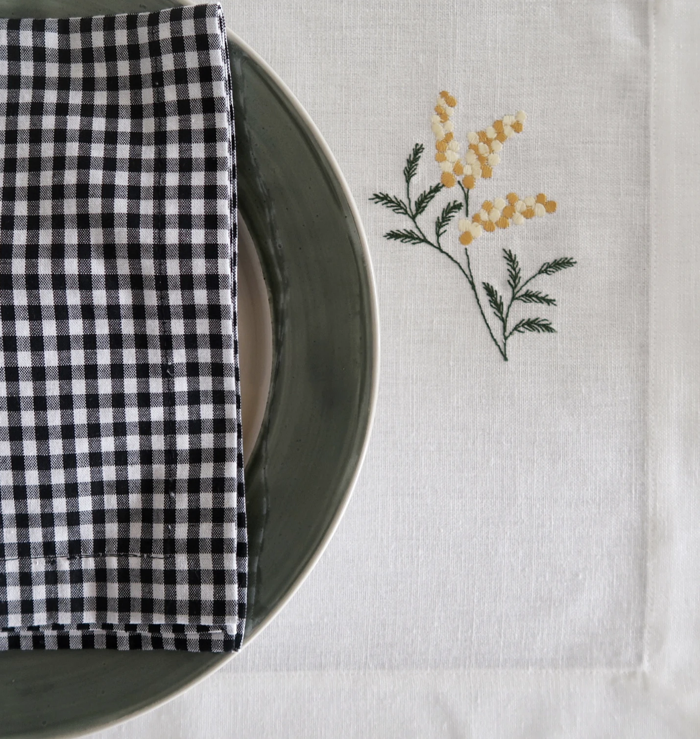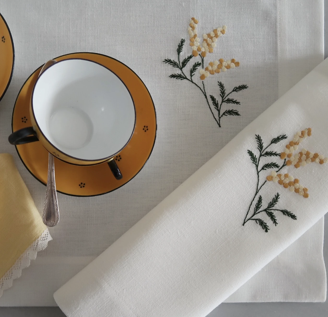 Mantel individual bordado con una flor de mimosa para la mesa. De 100% lino o de polilino lavado de gran calidad. Ideal para uso diario. Práctico para lavar y planchar. tiene un estilo que no pasa de moda. Es un básico que convierte en especiales tus mesas de diario. Además, podemos personalizarlo con tus iniciales bordadas o con una sencilla y elegante guirnalda bordada. También puedes escogerlo liso para combinar con nuestras servilletas bordadas.