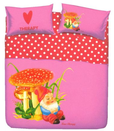 La sabana encimera con un dibujo estampado de un enanito de jardín apoyado en una seta; la vuelta de almohada, a juego con la bajera es de fondo rojo con topos blancos bajera ajustable estampada de fondo rojo con topos blancos.