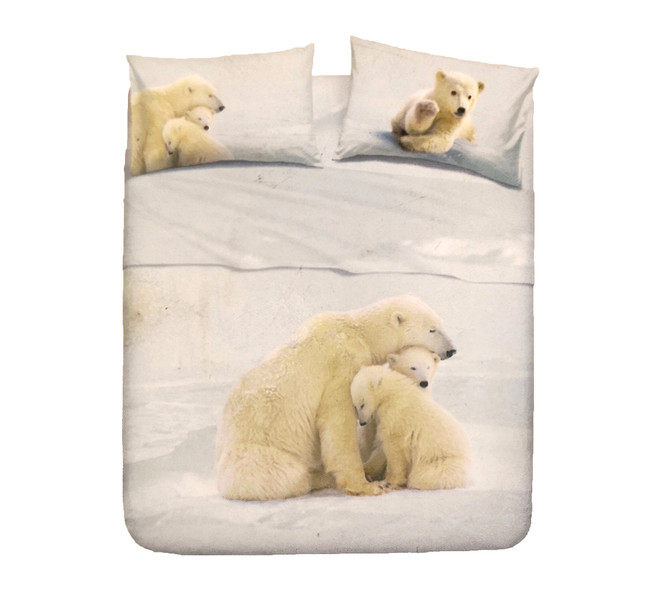 La sabana encimera con una imagen tres osos polares, la madre y dos oseznos, sobre un fondo blanco nieve.