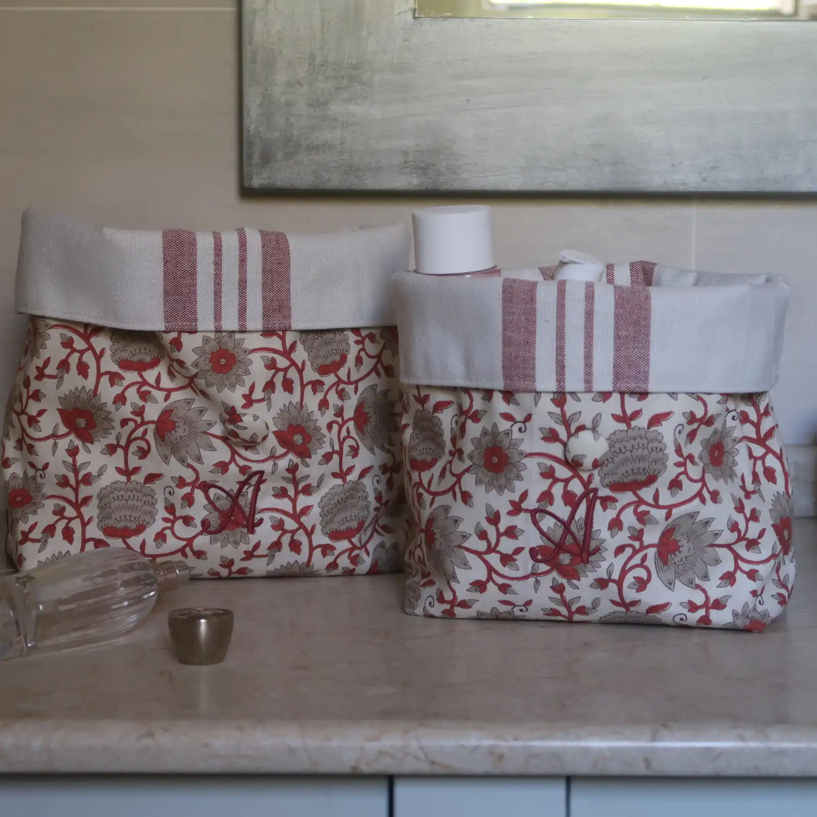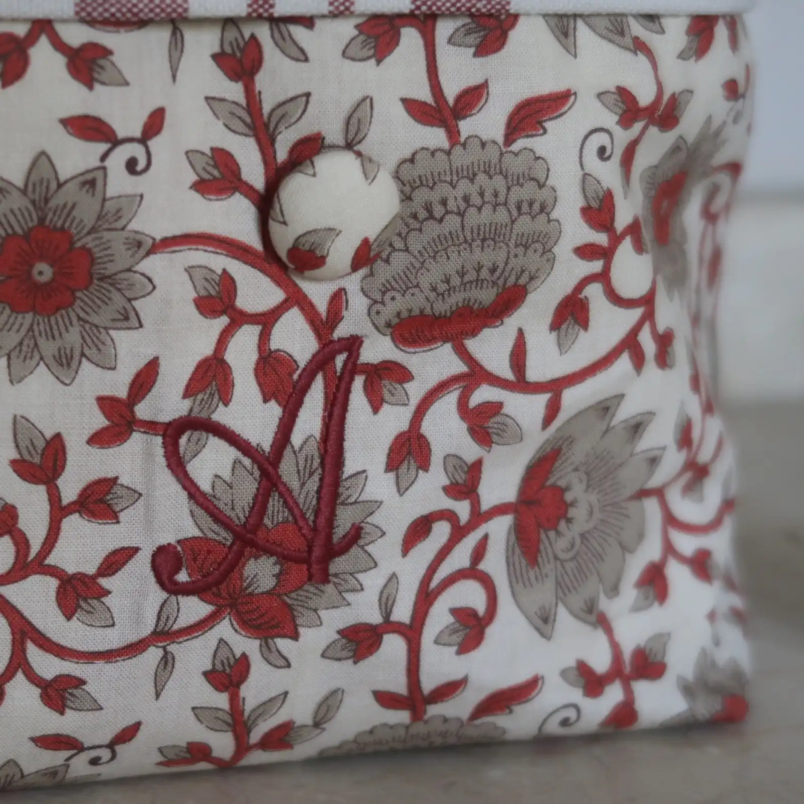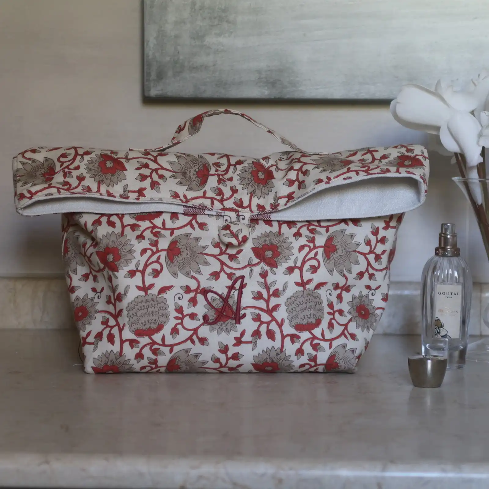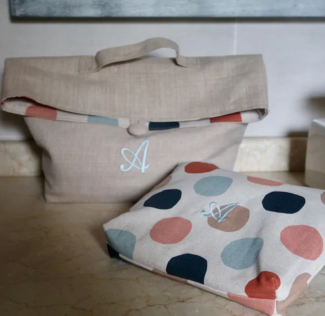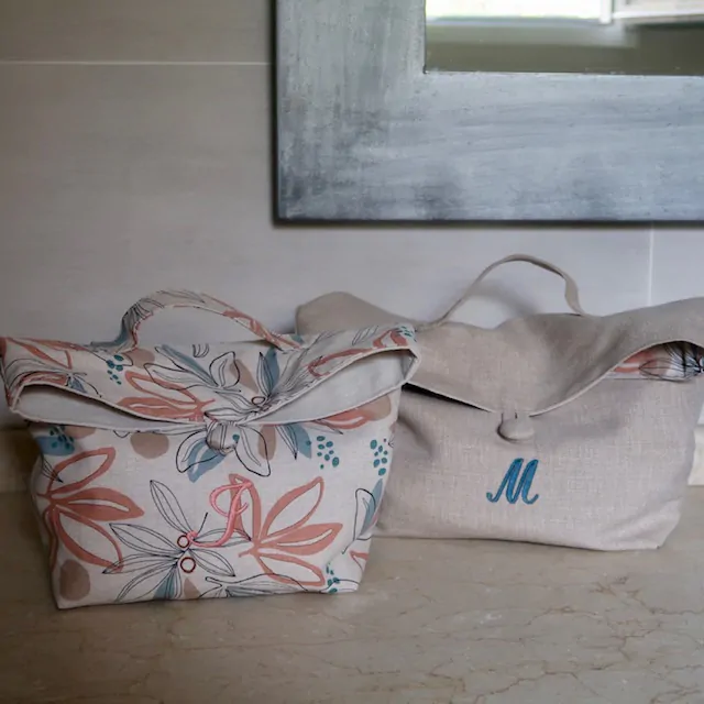 El neceser más original que se convierte en una cestita, para que puedas utilizarlo cerrado con su botón y su asita para llevarlo de viaje y también para tener a mano todos los productos de aseo cuando lo transformas en una cesta. Cada neceser se hace a propósito, para ti, con tus iniciales bordadas en rojo oscuro, en tipografía inglesa, la más sobria y elegante a la vez.