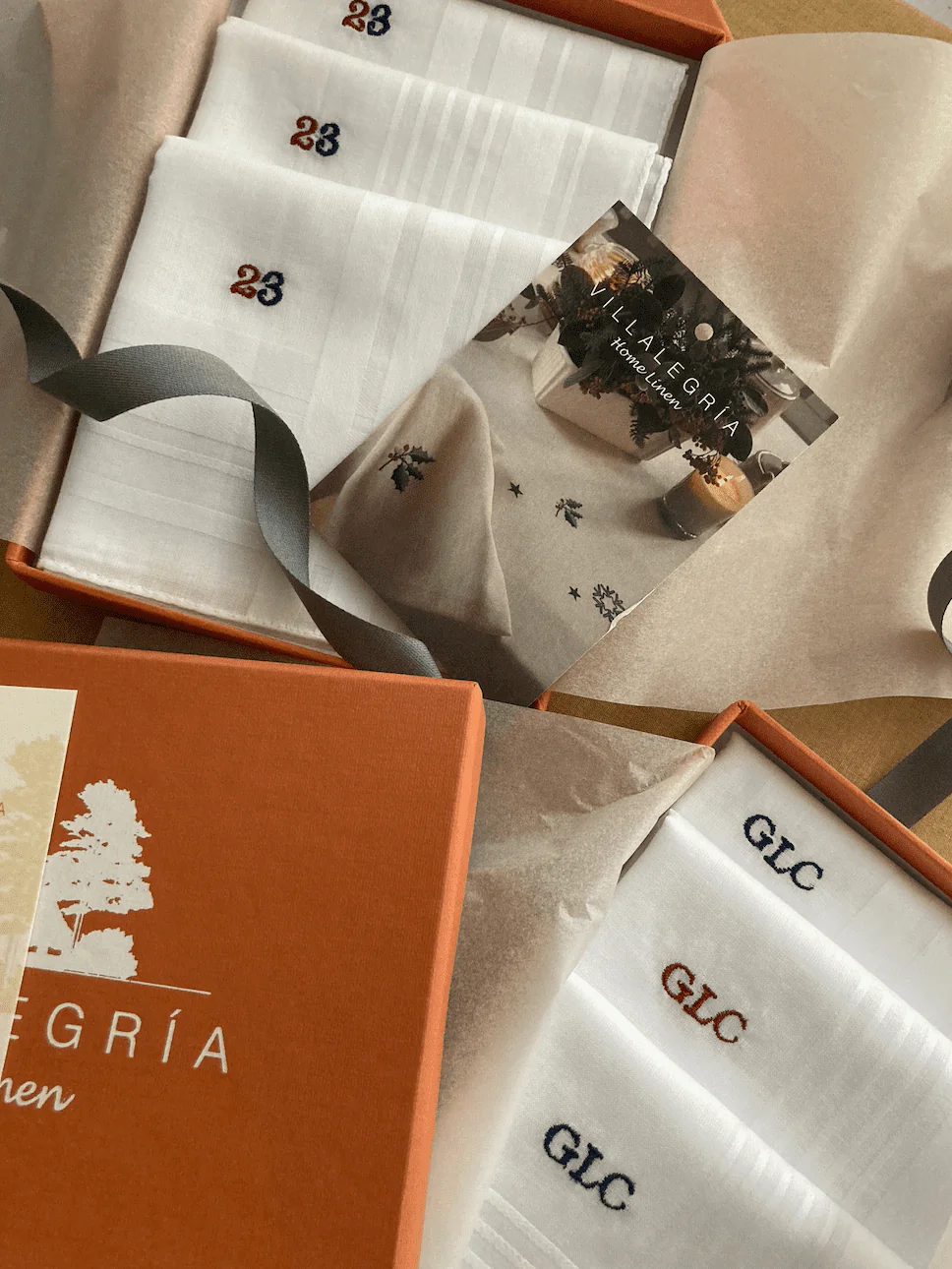 Presentados con el cuidado que se merecen, nuestros pañuelos llegan en una cajita de regalo exquisitamente diseñada, listos para sorprender. El toque final  llega con su envoltura en papel de seda, agregando un aire de anticipación y emoción. Ya sea para un evento especial o como un regalo pensado con cariño, los pañuelos de algodón Villalegría son el regalo perfecto.