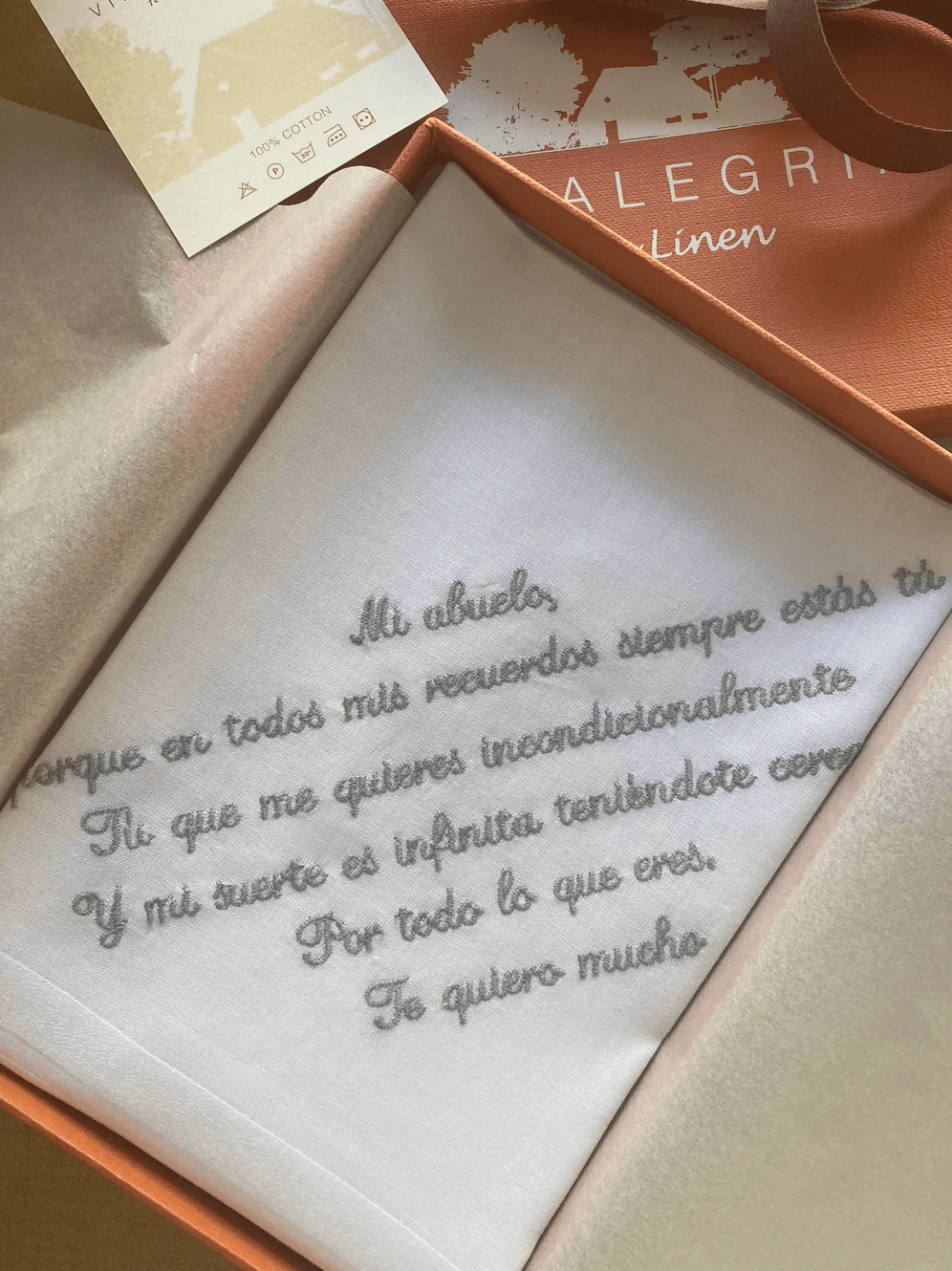 Lo que los hace aún más especiales es la posibilidad de personalización. Bordamos tu dedicatoria emotiva para transformar cada pañuelo en un recuerdo de tus sentimientos y estilo.