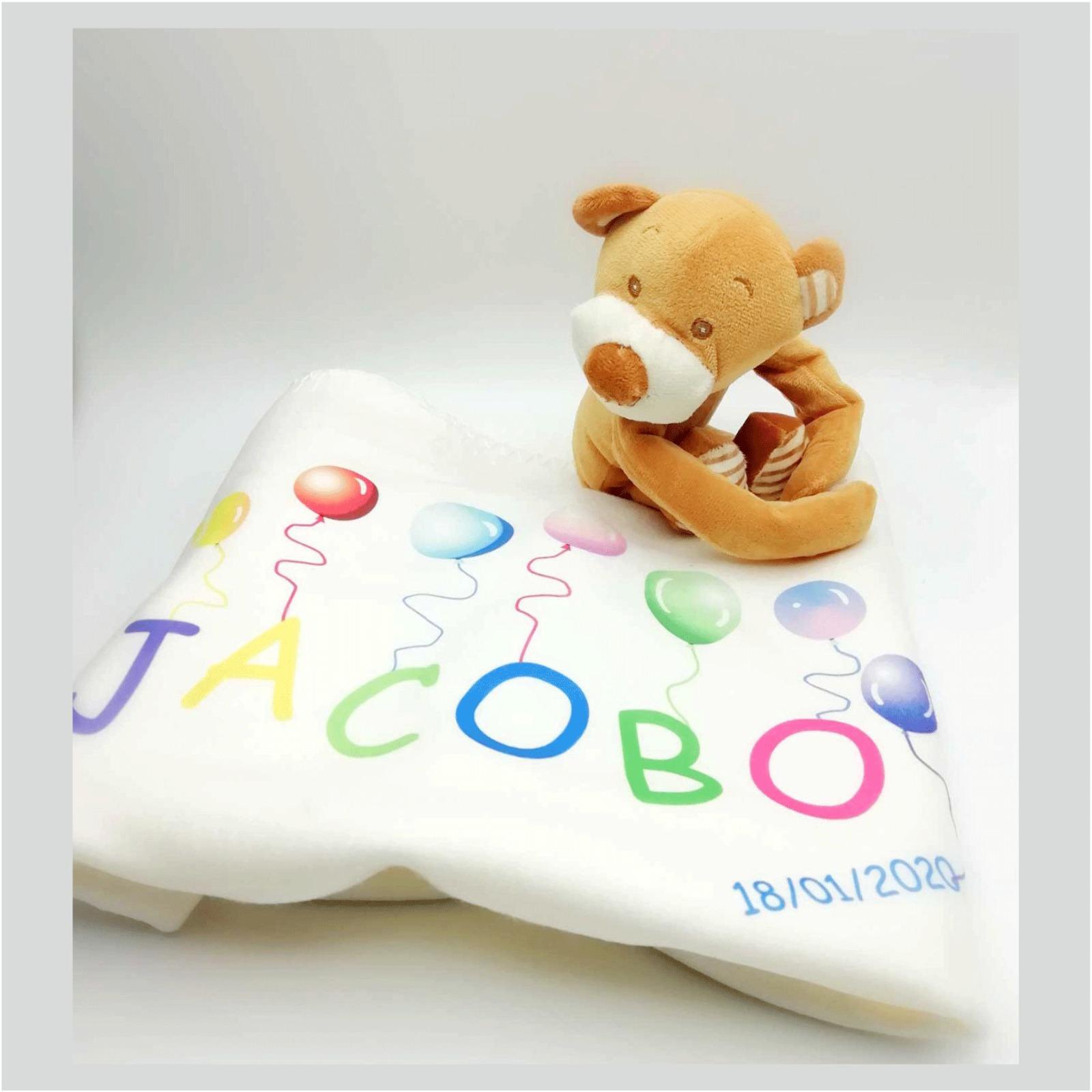 Simpático peluche con manta personalizada para regalar a un recién nacido