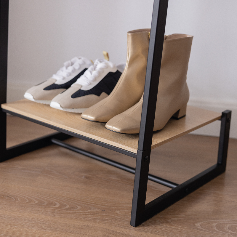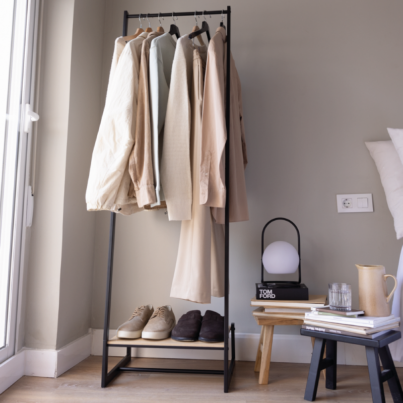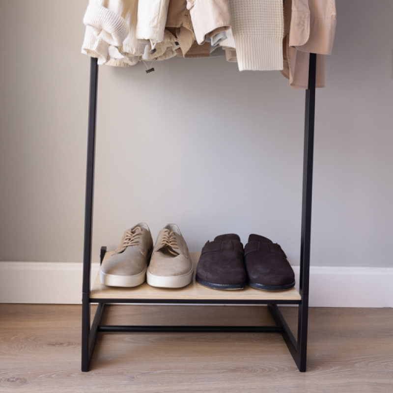 Además de para aumentar el espacio de almacenamiento y tener tu ropa más visible y ordenada para encontrarla fácilmente, su base sirve como zapatero o para colocar cestas de almacenaje.
