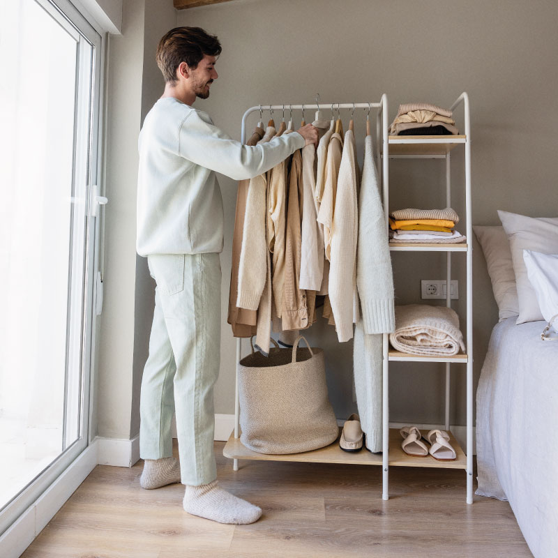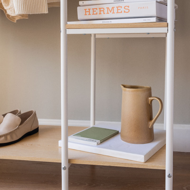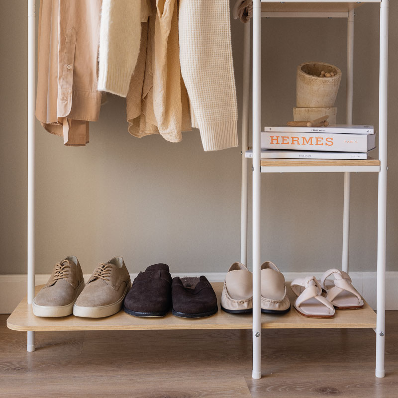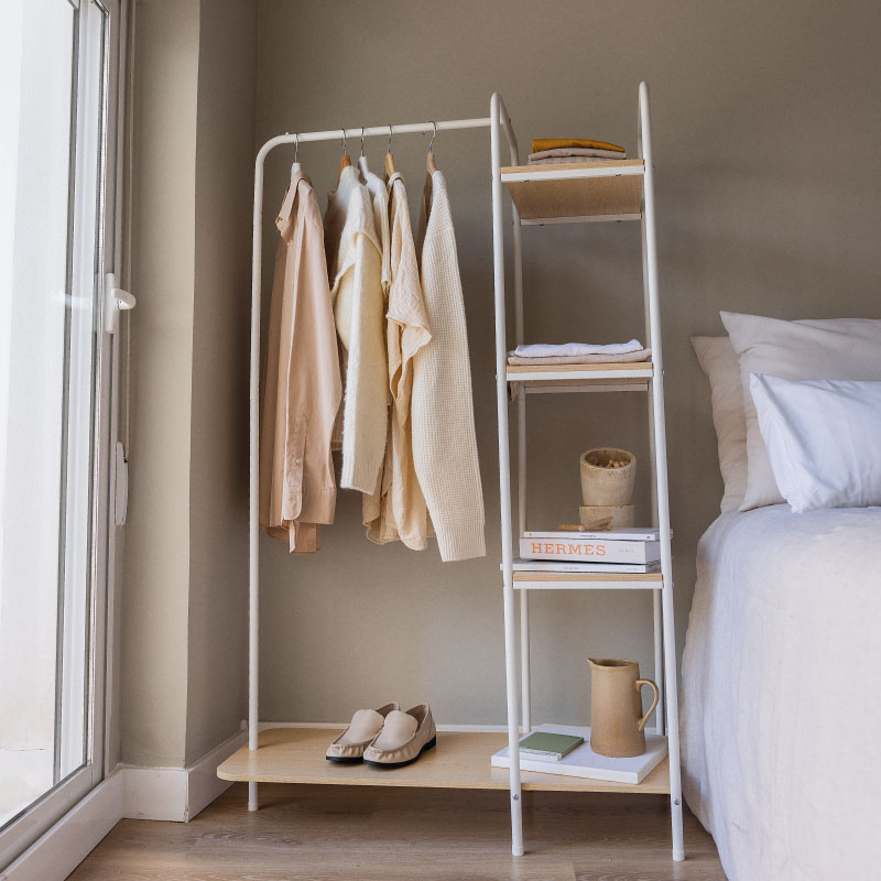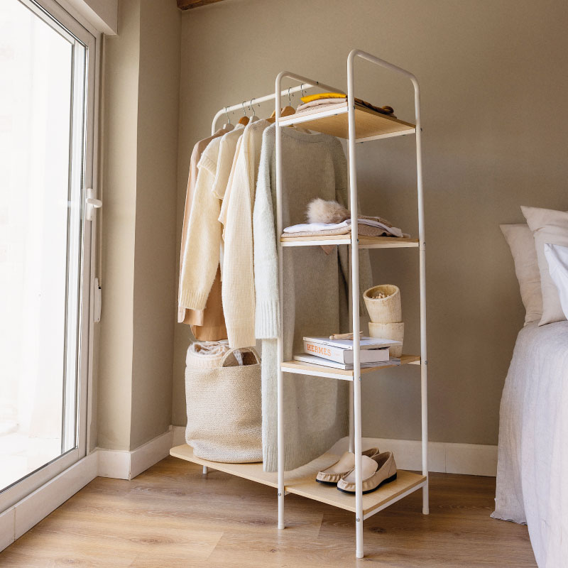 Además de para aumentar el espacio de almacenamiento y tener tu ropa más visible y ordenada para encontrarla fácilmente, úsalo como armario abierto, perchero burro y zapatero.