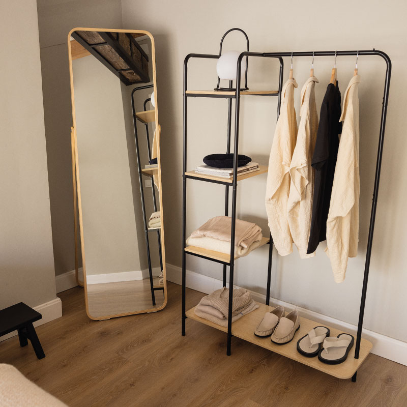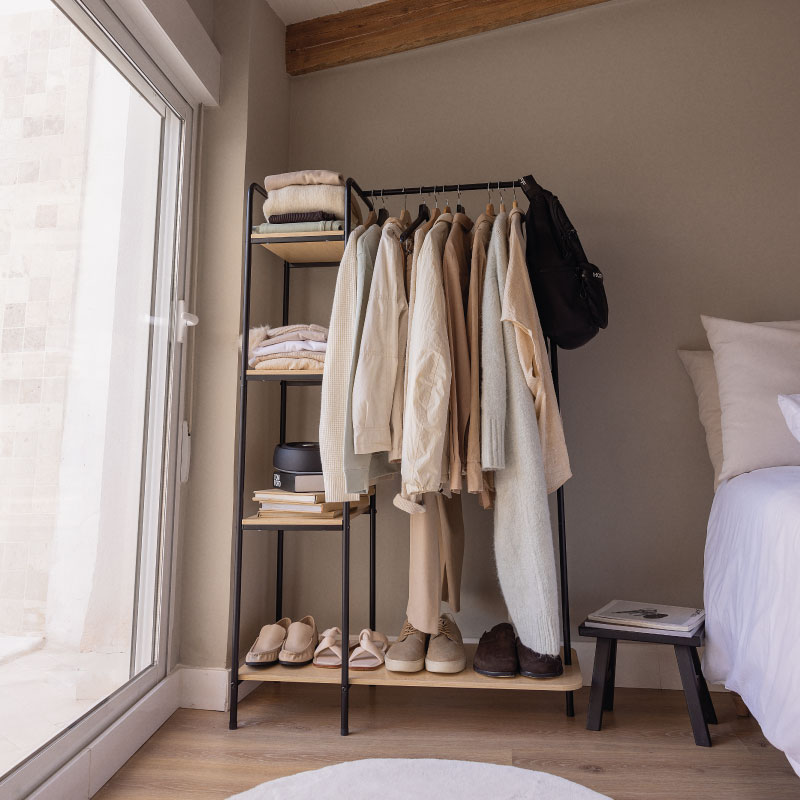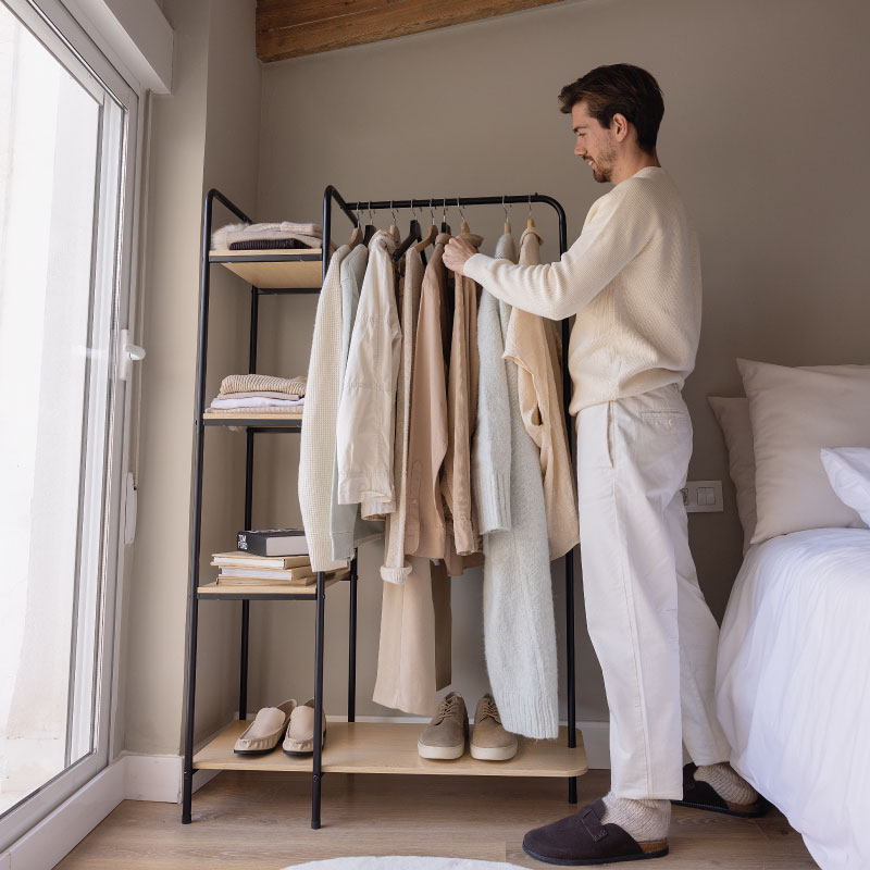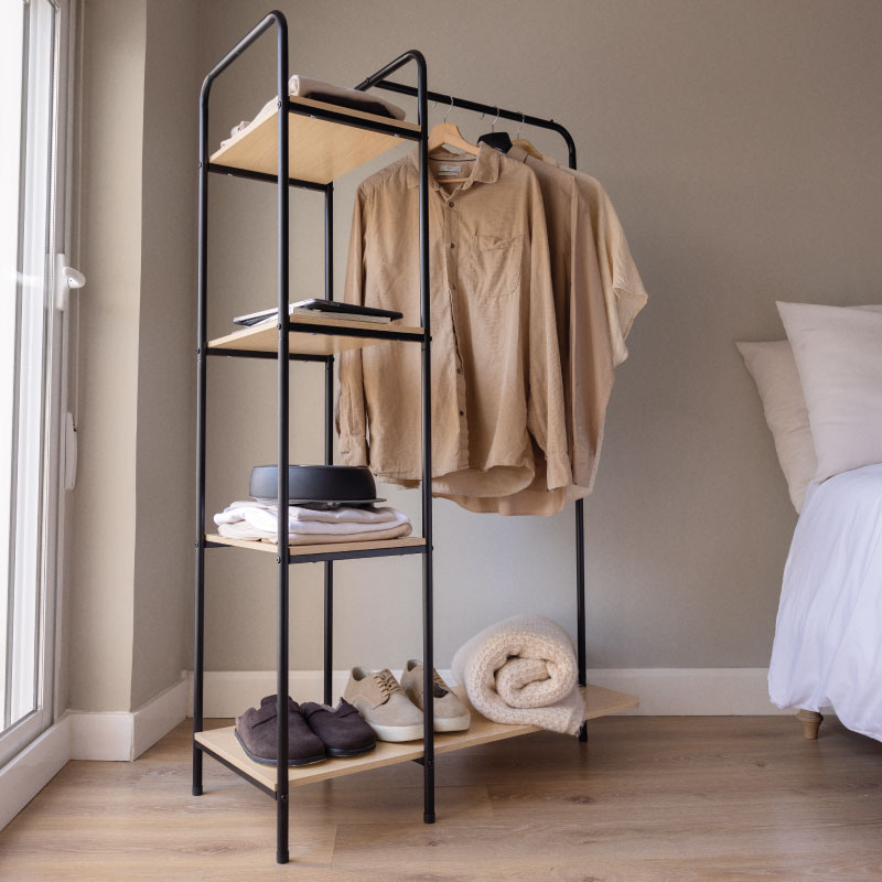 Además de para aumentar el espacio de almacenamiento y tener tu ropa más visible y ordenada para encontrarla fácilmente, úsalo como armario abierto, perchero burro y zapatero.