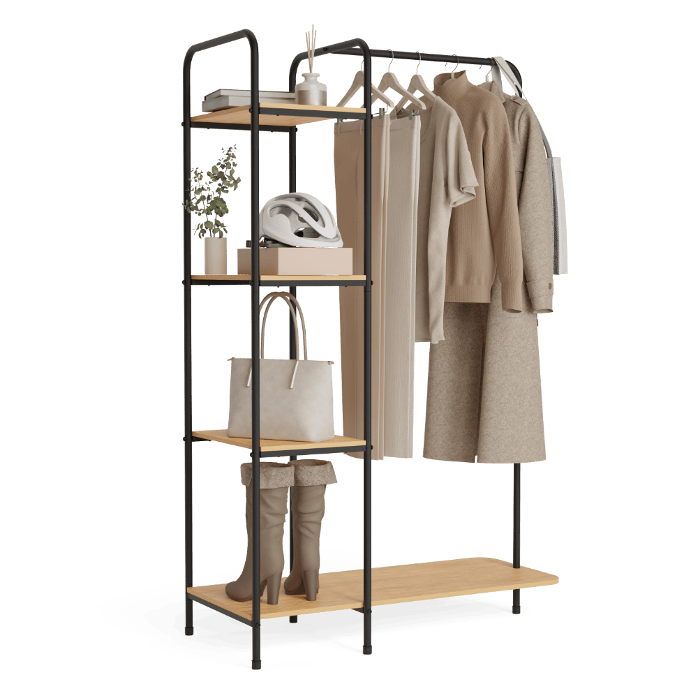 Cuenta con una altura de 139 cm para colgar prendas de diferentes longitudes. Además, también incorpora 4 estantes de madera de gran tamaño (42×28 cm) para guardar tus camisas, camisetas, ropa interior y pantalones plegados.
