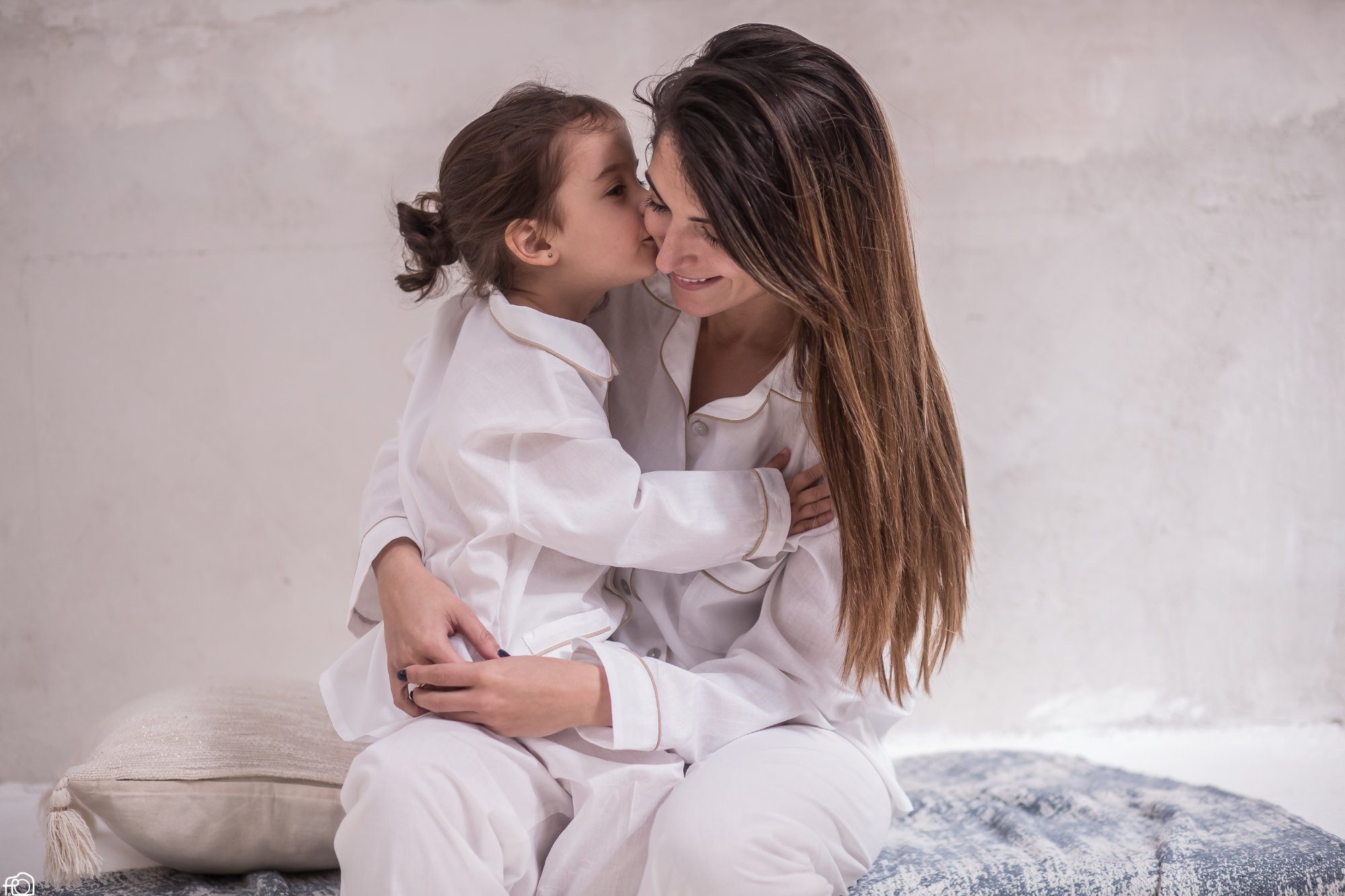 Descubre nuestro elegante pijama infantil hecho en España con vivos de diferentes colores. Hecho a mano con tela blanca 100% de algodón.