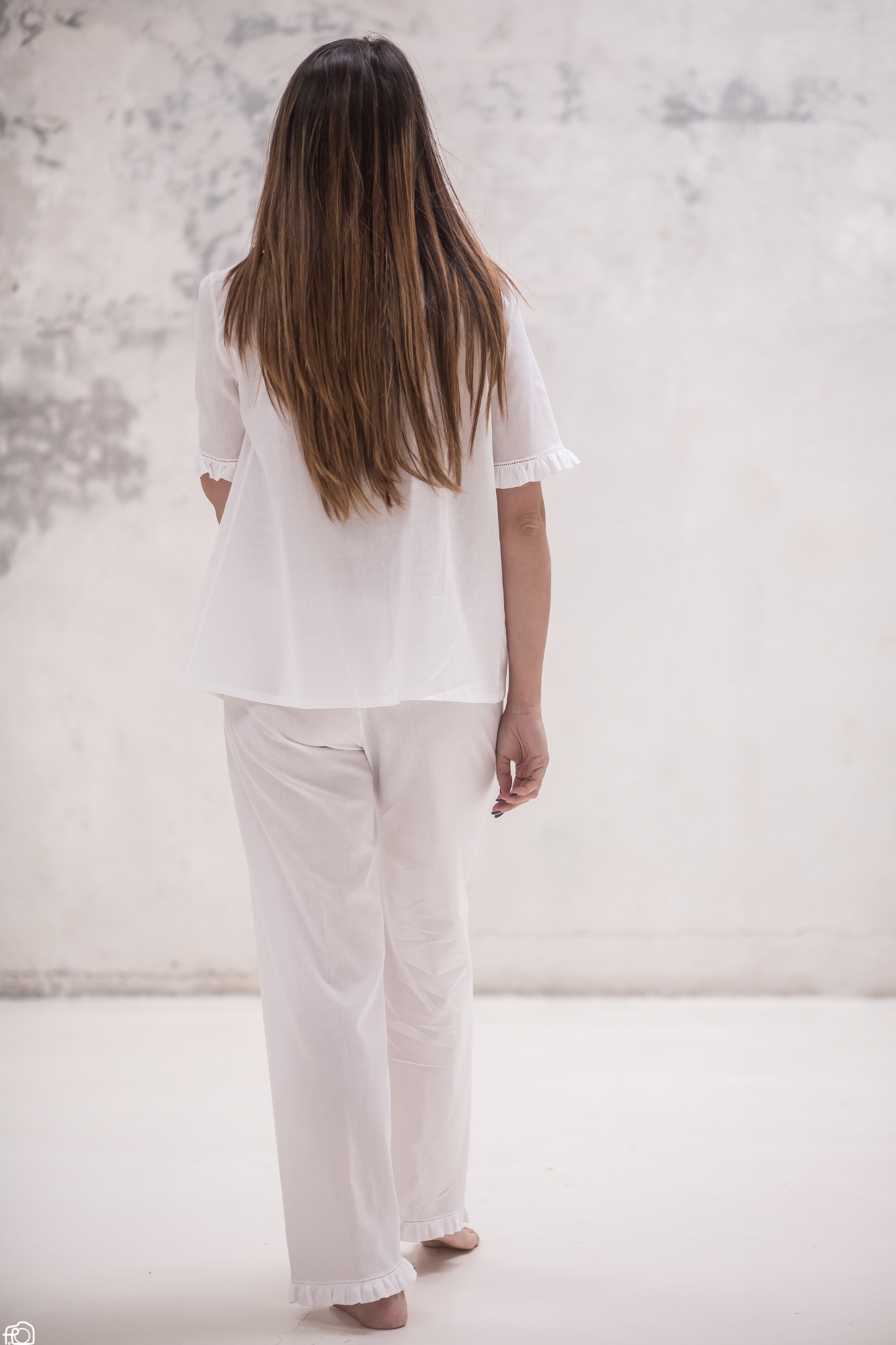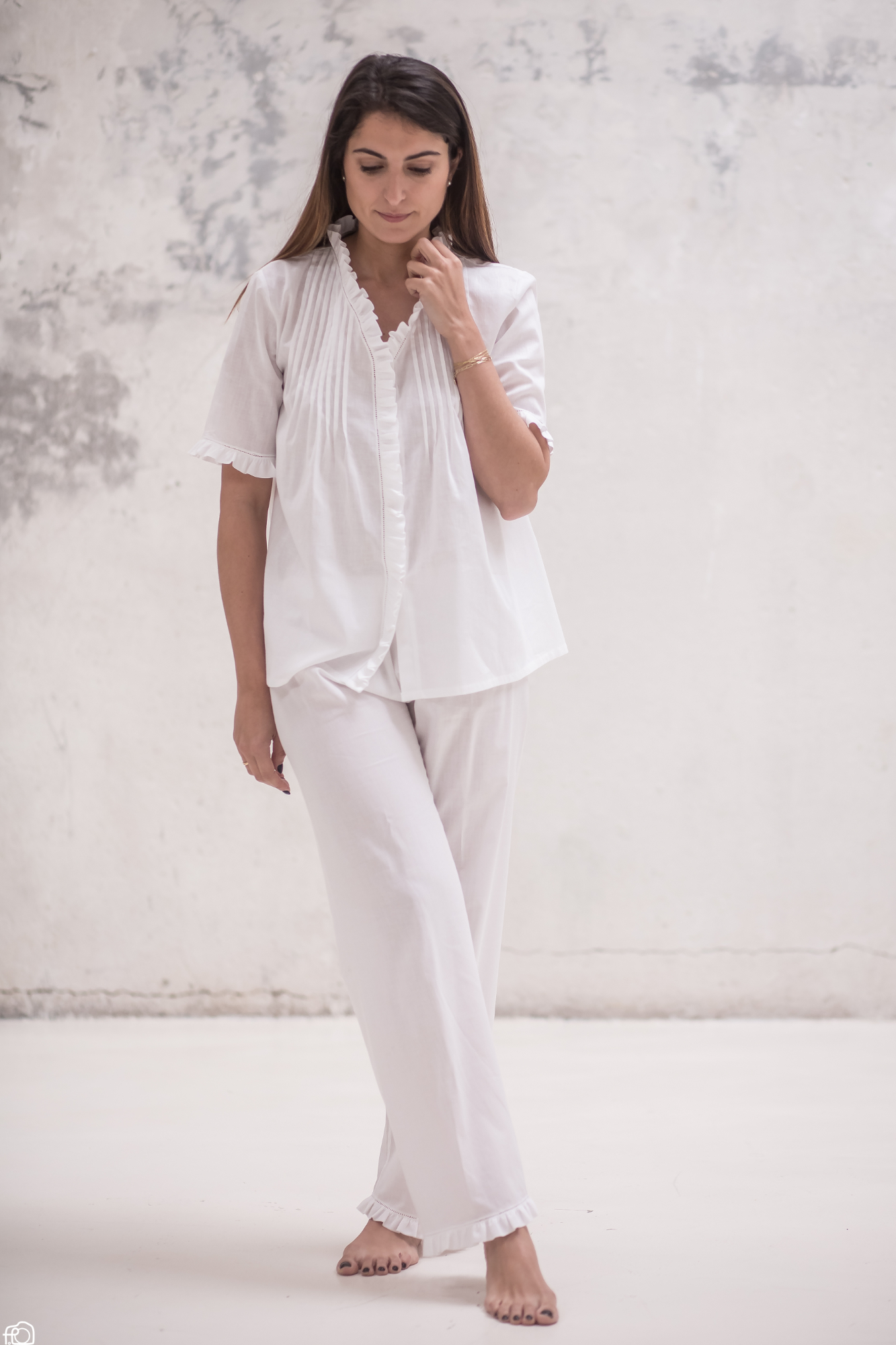 Original pijama largo de mujer con volantes hecho a mano. Elige tu versión favorita en pantalón largo o corto. Y de sisa, en manga corta o manga larga. En nuestro atelier creamos prendas únicas para ti como se hacían antaño.