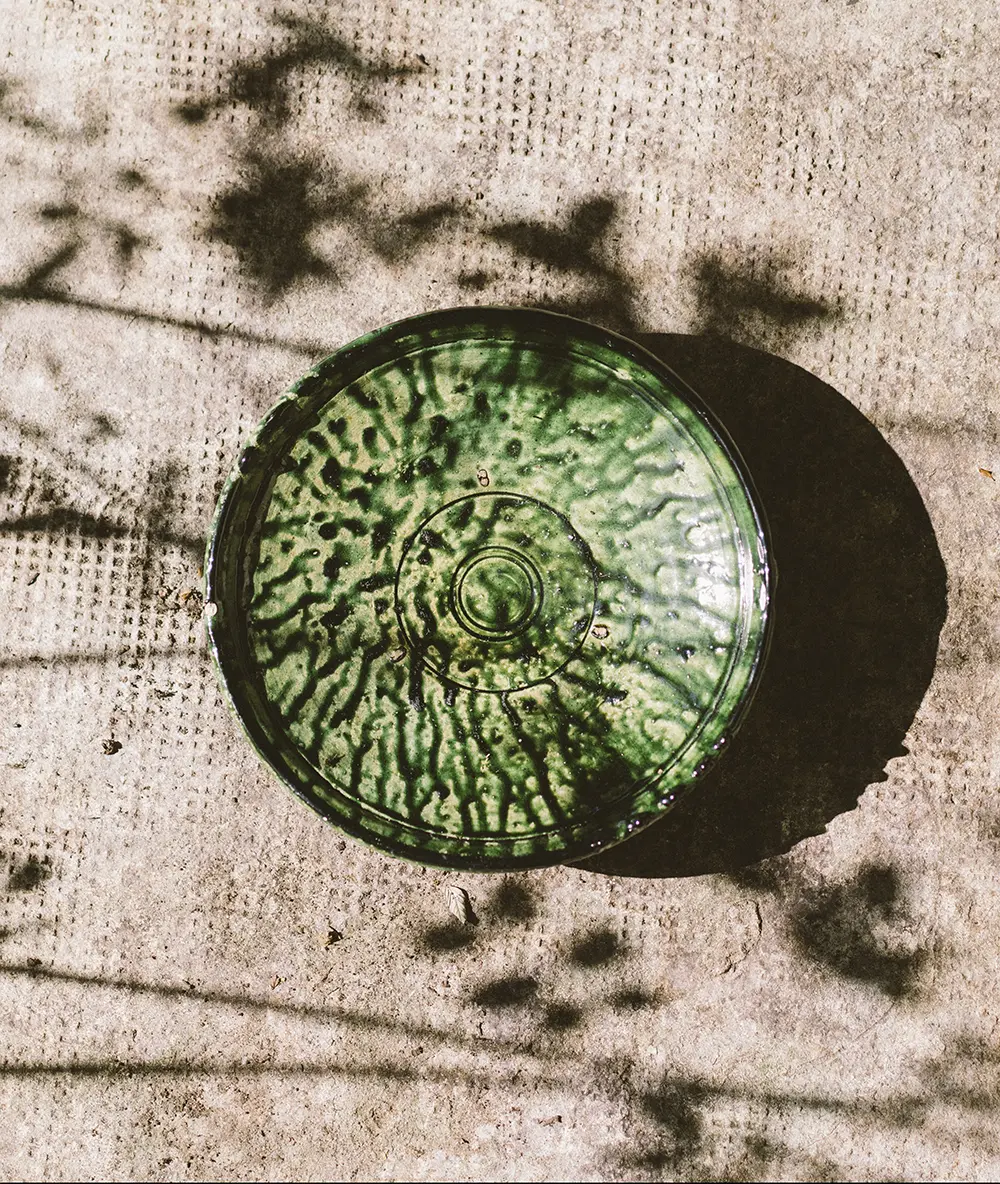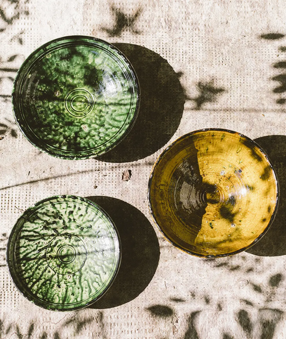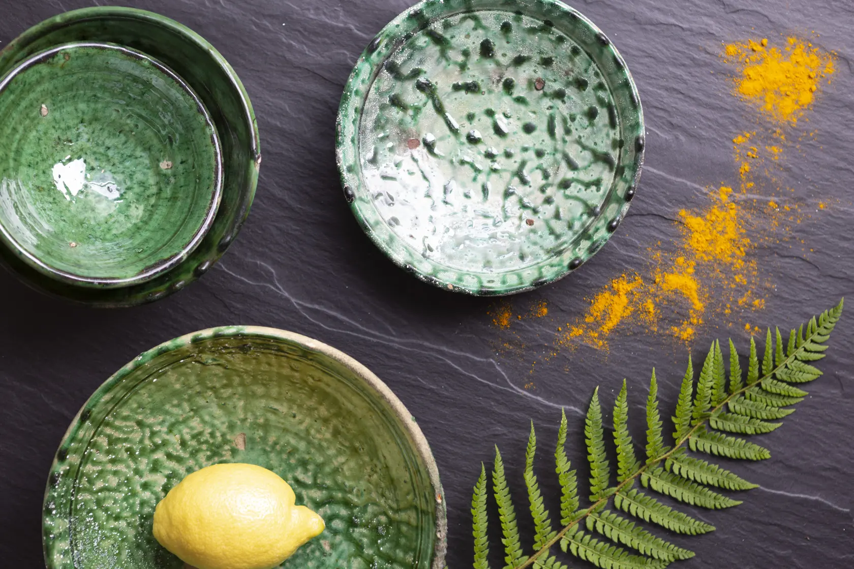 La cerámica de Tamegroute en Marruecos, es única. Alegrará tus mesas y le dará un toque rústico y diferente. Disponible el plato hondo, plato llano, cuencos y las fuentes. Esta cerámica se realiza a mano, en barro o arcilla esmaltada con cobre y manganeso. Una vez salida del horno, su color se transforma en este verde tan característico y único. Se trabaja por los artesanos en grandes plataformas con una técnica secreta que ha pasado de padres a hijos. Esta pieza de cerámica conserva la tradición de un oficio centenario.