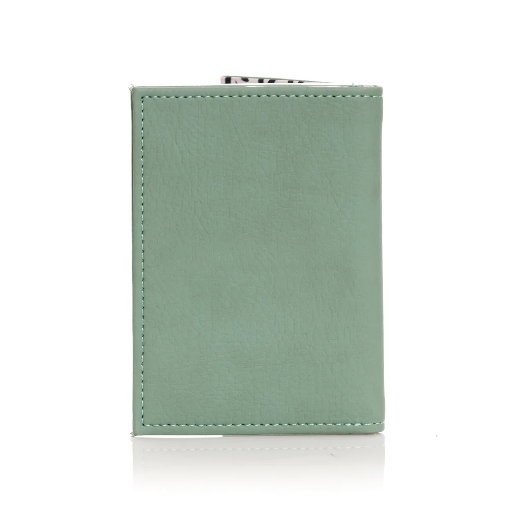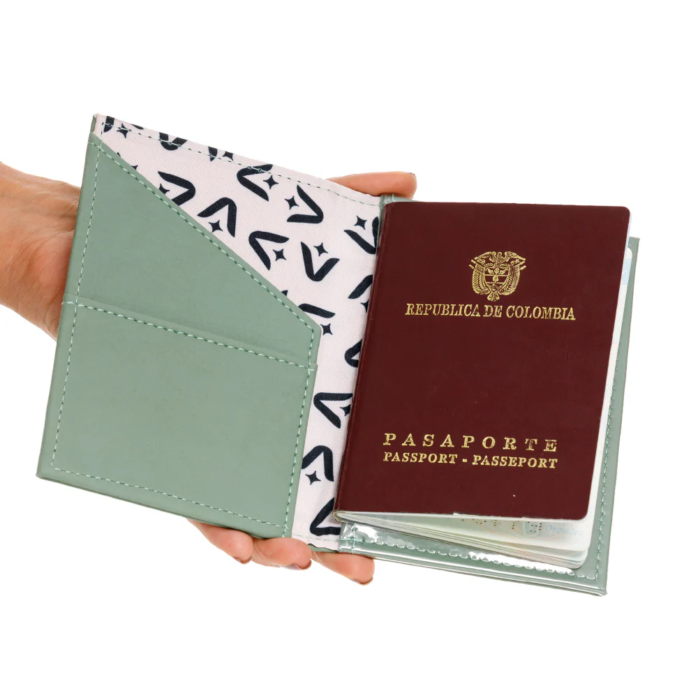 Portapasaporte en color sólido verde. Interior con compartimientos estampados y material vinilo, exterior en cuero vegano 100% colombiano.