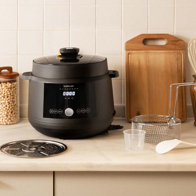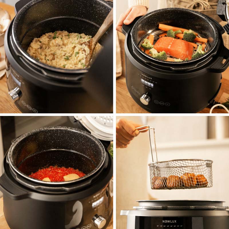 Gracias a su diseño, el calor se reparte de forma homogénea envolviendo la cubeta y distribuyendo la temperatura de forma uniforme, aprovechando toda su potencia aumentada de 1200W para unos resultados de cocción profesionales conservando los nutrientes de los alimentos y aportando sabores más concentrados, por el efecto de presurización.