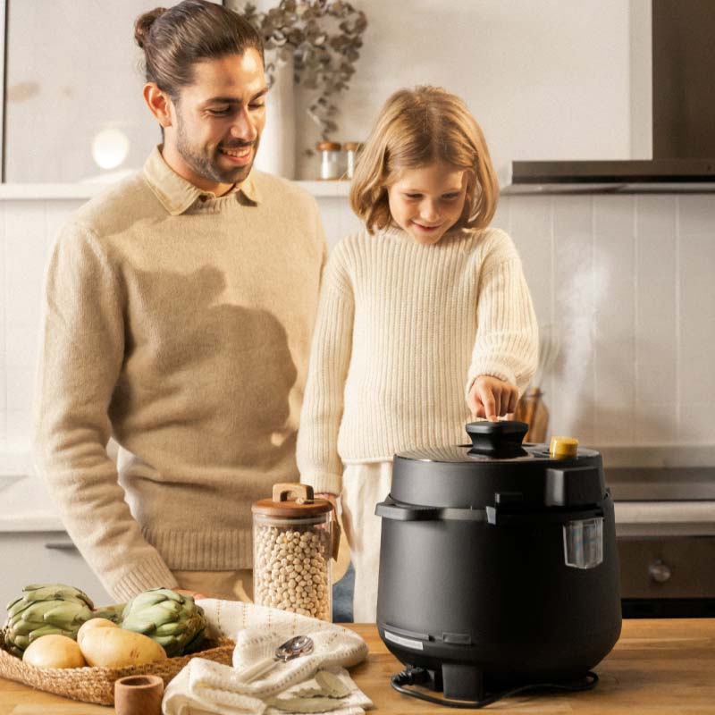 Pon los ingredientes dentro de la cubeta, selecciona el programa deseado y cuando quieres comer, el robot de cocina con presión no necesita supervisión y mantiene tu comida caliente hasta que llegues.