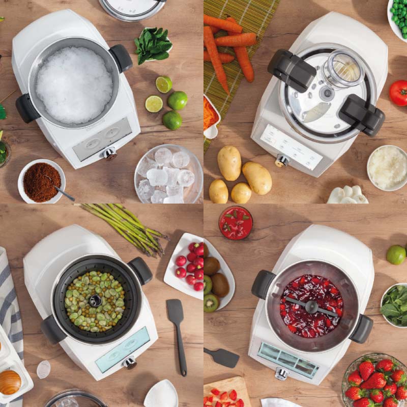 Hasta 14 utensilios de cocina en 1 sólo robot: olla de cocción, sartén, termo, báscula, batidora, vaporera, picadora, batidora de repostería, arrocera, amasadora, trituradora, rallador, licuadora y microondas. El robot incluye 3 tapas: tapa de cocinado, tapa para cortar o rebanar alimentos y vaporera 2 niveles. ¡Ahorra tiempo y espacio!