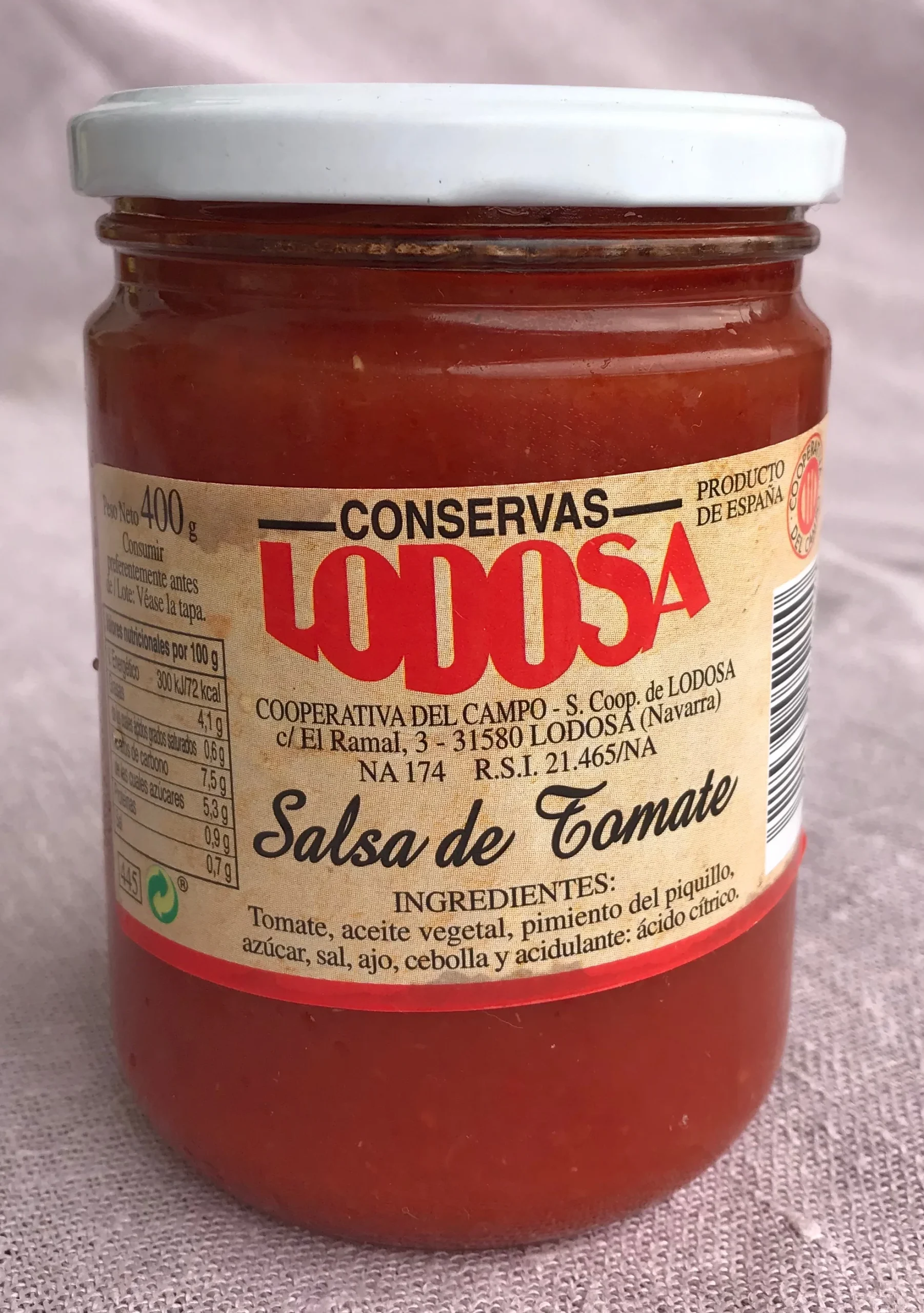 Salsa de tomate Lodosa lista para el consumo. Bote de 400 g
