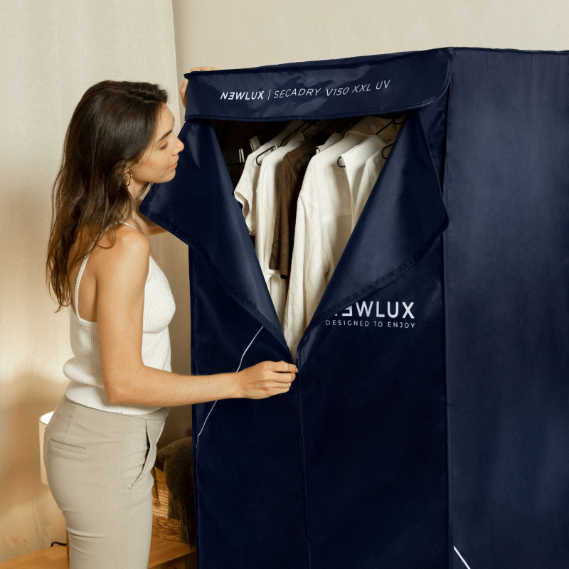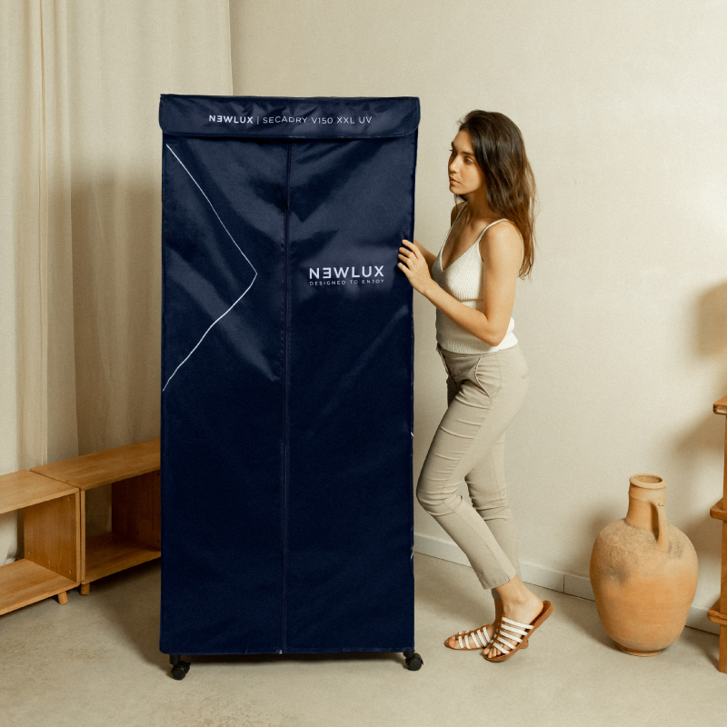 Durante la última etapa del proceso de secado, la secadora portátil activa la luz UV para desinfectar hasta el 99% de los gérmenes y bacterias. Elimina bacterias, hongos y partículas nocivas de cualquier tamaño o concentración (<0,1 micras). ¡Mayor limpieza y desinfección imposible!