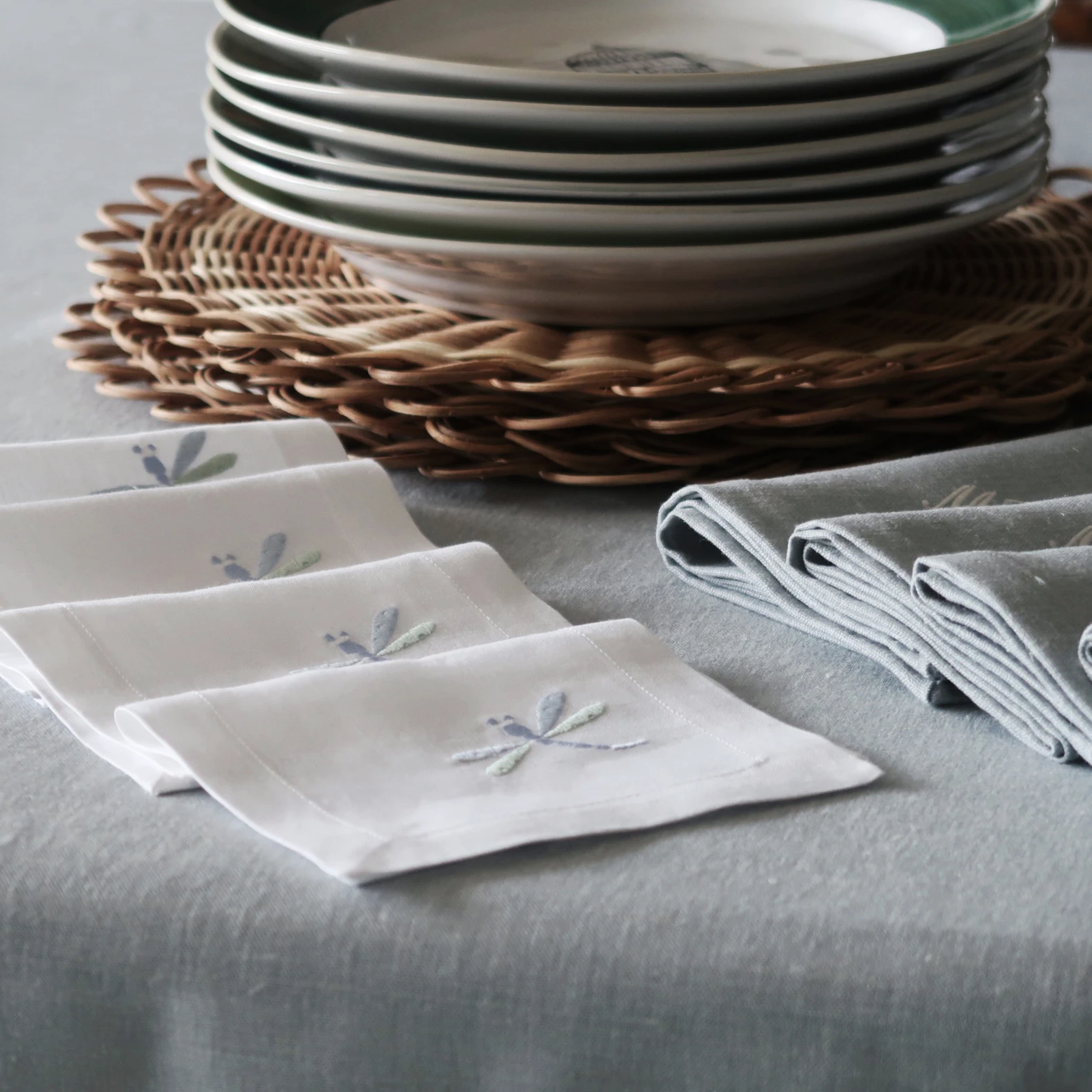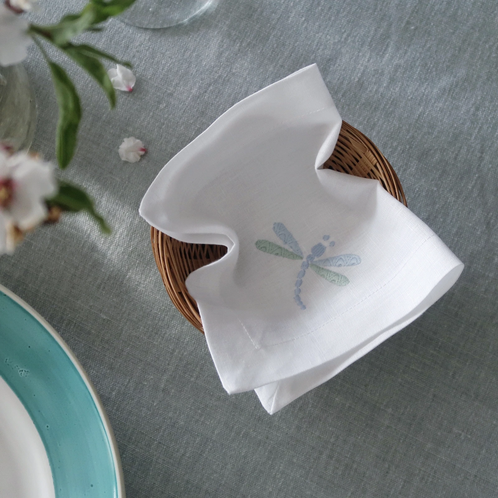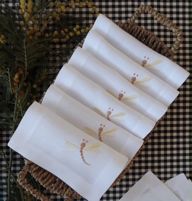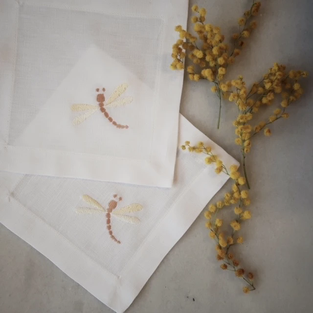 La servilleta de cóctel Libélula es puro capricho para la mesa. Con una medida de 16 x 16 es una servilleta en la que bordamos una pequeña libélula que combinamos en dos colores, azul y verde, y amarillo y beige oscuro. Están confeccionadas con lino cien por cien de color blanco o marfil.