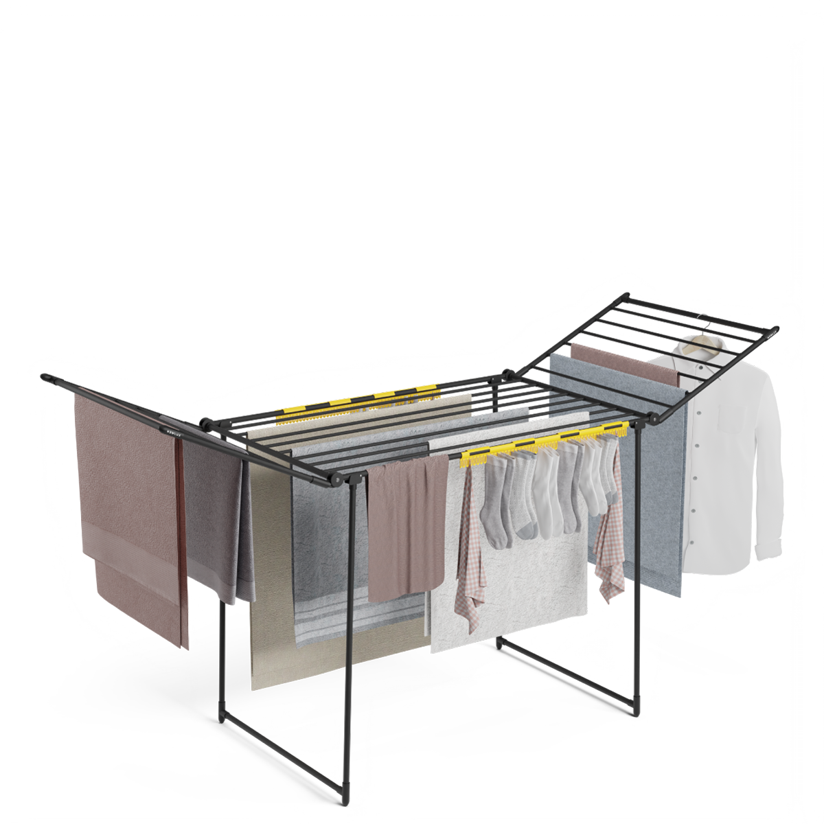 Alas plegables que permiten un secado eficaz e Incluyen un sistema de bloqueo para un transporte y guardado mucho más cómodo.