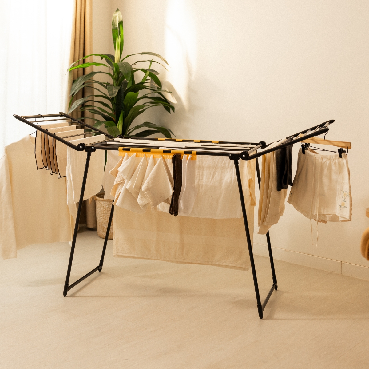 Incluye en la base piezas antideslizantes que permiten mantener el tendedero firme y evita rayar el suelo incluso cuando está lleno de ropa.