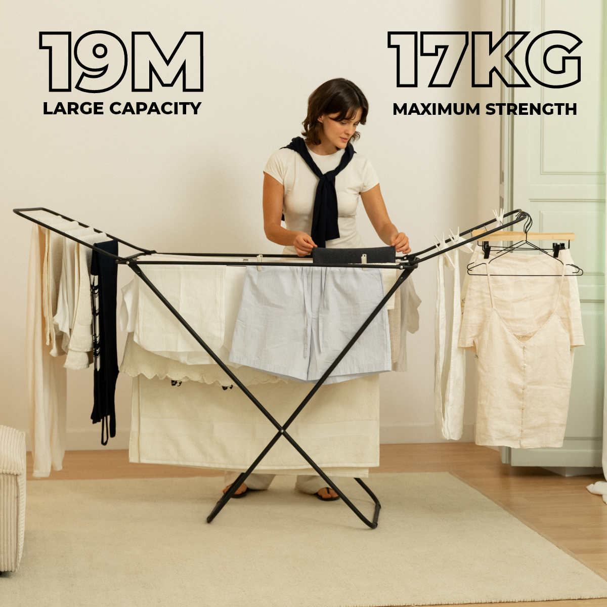 El tendedero plegable tiene una capacidad total de 19 m de secado repartidos entre sus alas y su cuerpo, con una longitud total de tendido es de 185 cm de ancho. Medidas: