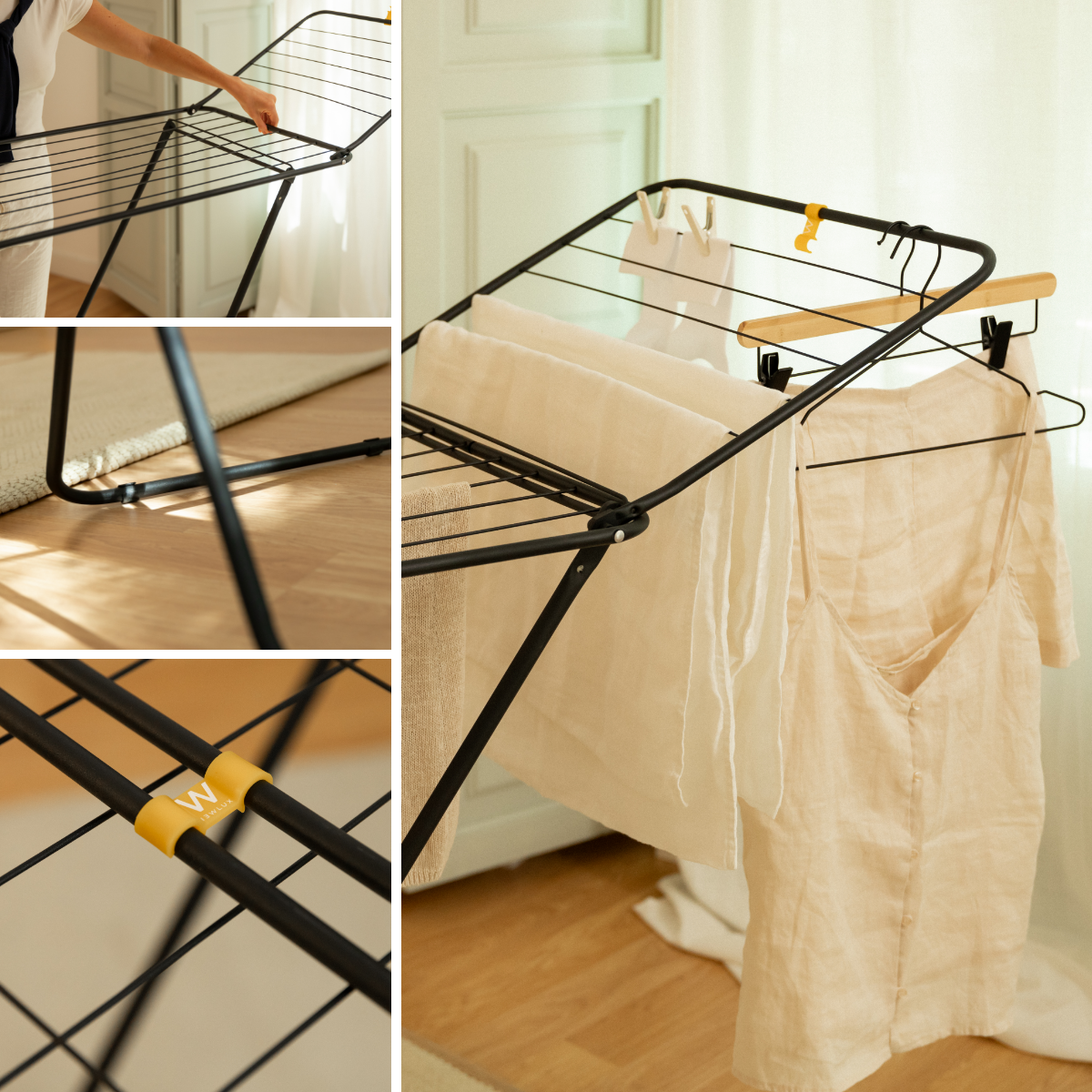 Incluye en la base piezas antideslizantes que permiten mantener el tendedero firme y evita rayar el suelo incluso cuando está lleno de ropa.