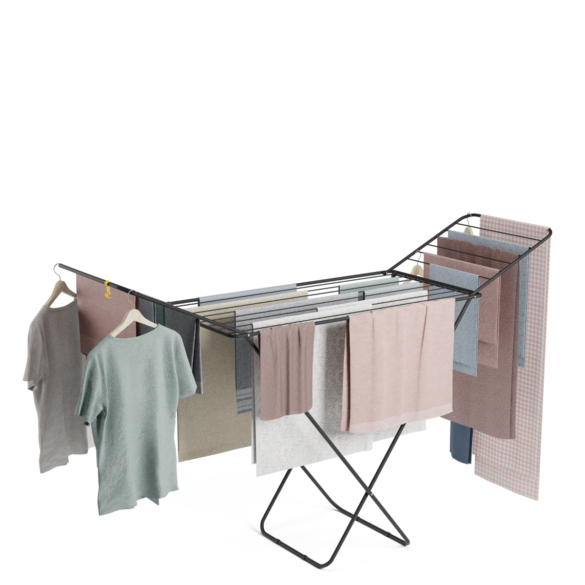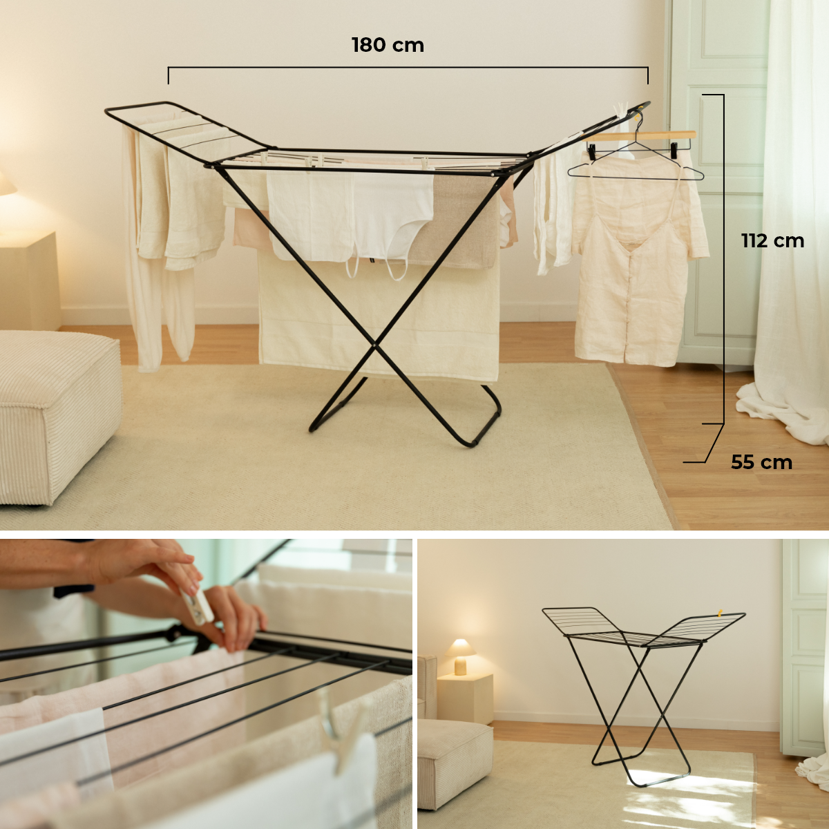 Gracias a su diseño, tiende cómodamente ya que su altura está en la medida perfecta de 92 cm en la parte central hasta 112 cm en la parte más alta de las alas, evitando posiciones incómodas a la hora de tender.