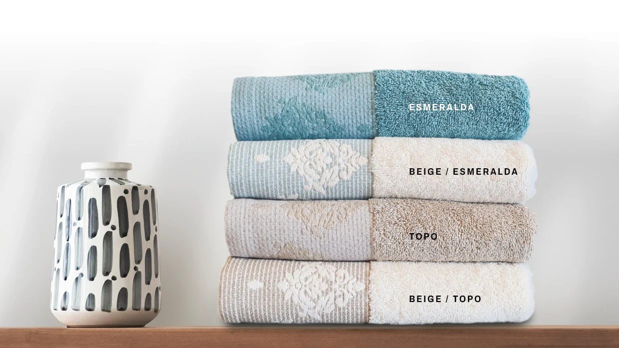 Gama de 4 colores: Esmeralda, Beige/Esmeralda, Topo y Beige/Topo.