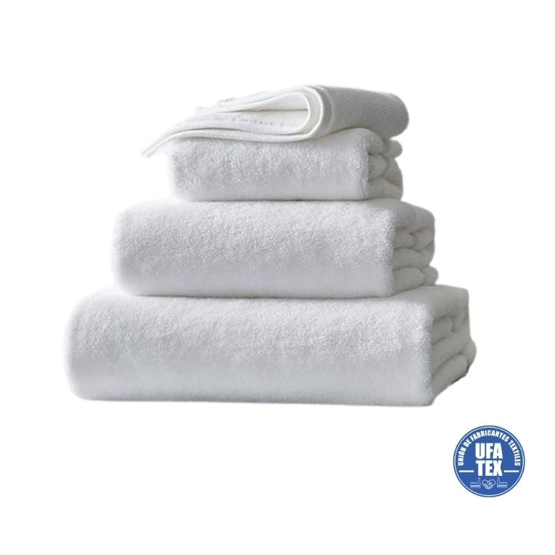 Toalla de rizo algodón puro 100% con cenefa tipo “GRECA” de alta calidad y larga duración. Con un gramaje de 500 gr./m2 y de hilado torcido a dos cabos la convierten en la toalla con mejor relación calidad-precio. Es ideal por su gran absorbencia, suavidad y resistente a múltiples lavados. Color blanco óptico. Posibilidad de personalizar con logototipo blanco o sobre fondo color..