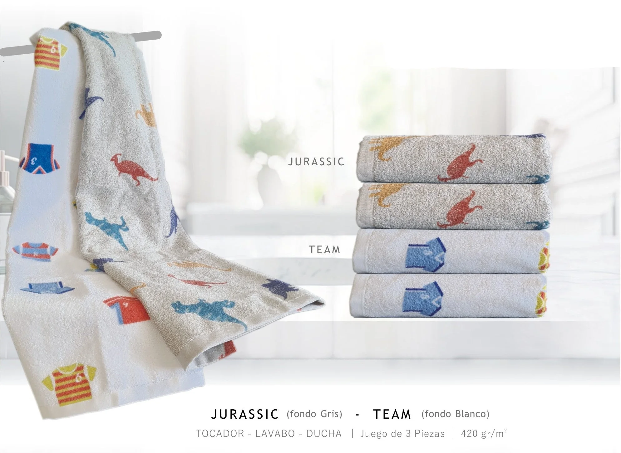 Toallas de 420 gr/m2 de rizo estampado y de dos estampados diferentes.