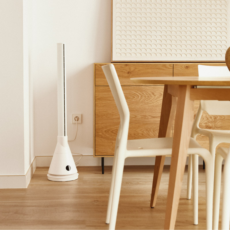 Tecnología sin aspas, sensor de protección contra el sobrecalentamiento y sensor antivuelco o cortes de energía para hacer el ventilador de torre más seguro.
