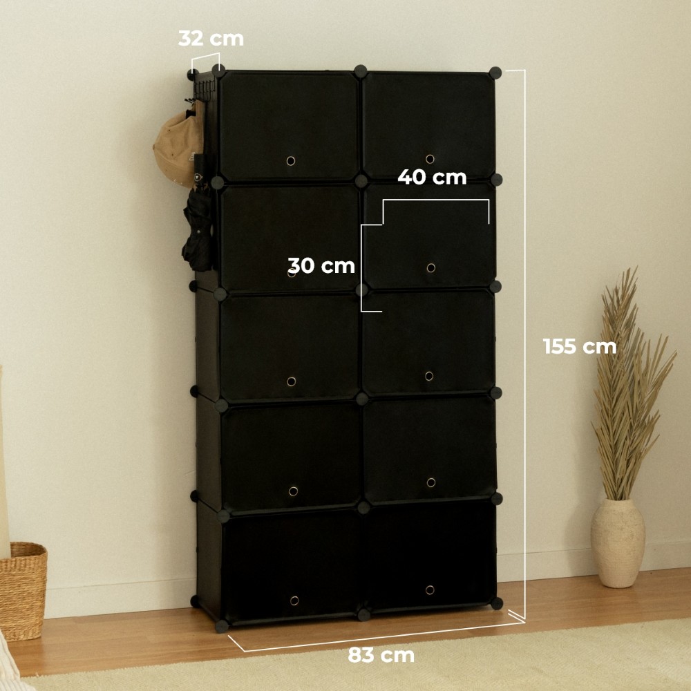 El armario cuenta con 10 cubos de 40x30x30cm (Ancho x alto x prof) de máxima capacidad, con hasta 20 compartimentos divididos y capacidad para 40 pares. Podrás elegir si usas cada cubo completo para zapatos más altos, o dividido por la mitad para meter el doble de pares, ropa y otros enseres. El zapatero tiene una capacidad volumétrica de 36L por balda, en total 360L de capacidad.